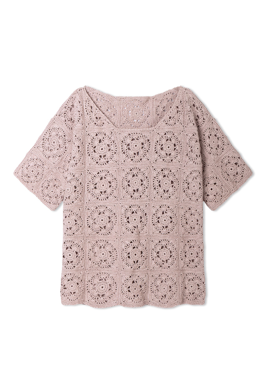 Lana Grossa-garen ‘Solo Lino’ (80% gerecyclede linnen (viscose), 20% linnen, ca. 120 m/50 g): ca. 800 g parelroze (kl 44); 1 haaknld 3,5 mm.