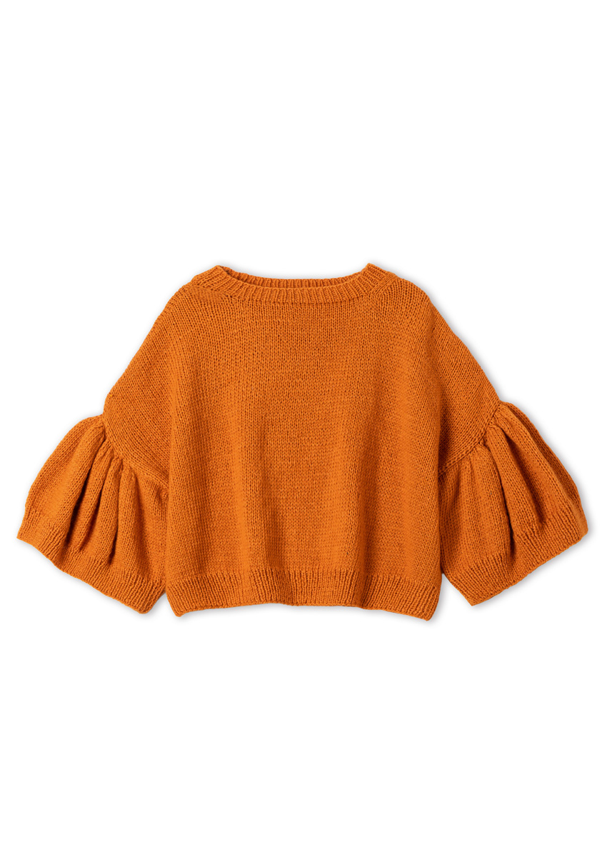 Lana Grossa-garen ‘Summer Softness’ (80% katoen (bio), 20% scheerwol (merino superfijn), ca. 130 m/50 g): ca. 400 (400 - 450 - 450) g bruinoranje (kl 22); breinld 4 mm en 5,5 mm. 1 korte rondbreinld 4 mm.
