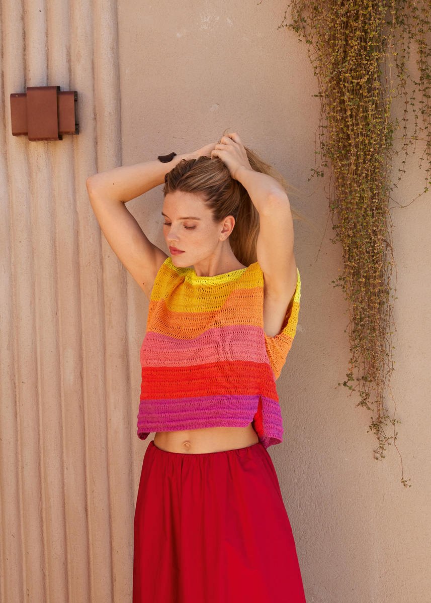 Lana Grossa Tessera (100% katoen, ca. 115 m/50 g), 50 (50 - 50 - 100) g in geel (kl 4), oranje (kl 5), mandarijn (kl 6), rood (kl 7), fuchsia (kl 9) en framboos (kl 10). Breinld 5,5 mm, 1 rondbreinld 5,5 mm, 40 cm lang