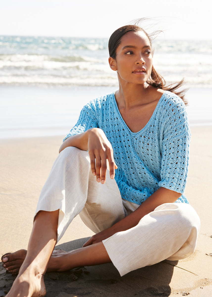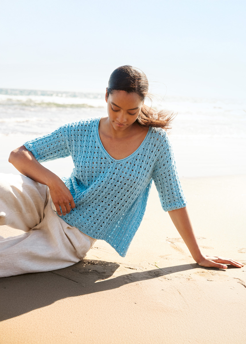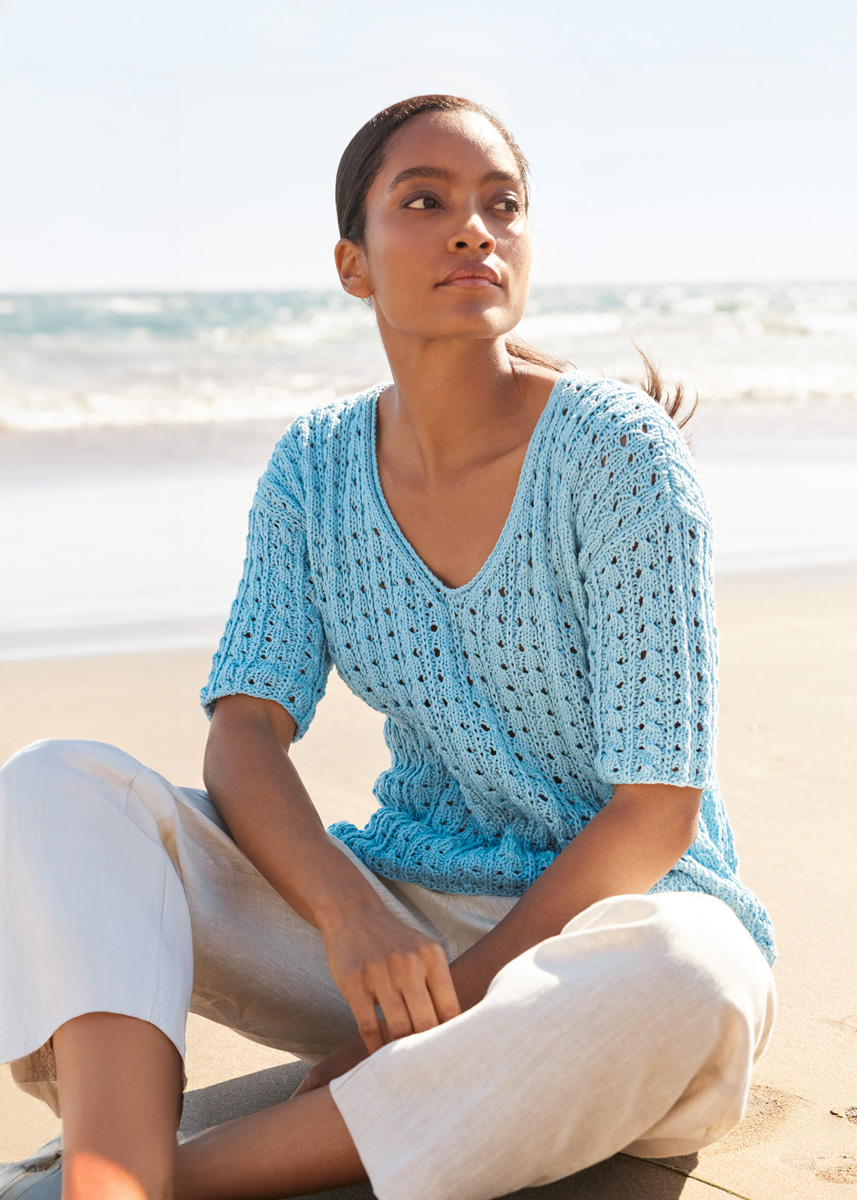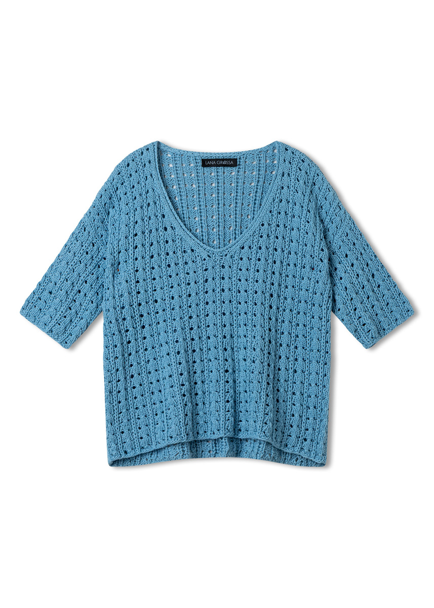 Lana Grossa Tessera (100% katoen, ca. 115 m/50 g), 400 (450 - 500) g in hemelsblauw (kl 13). Breinld 5 mm, 1 rondbreinld 5 mm, 50 cm lang.