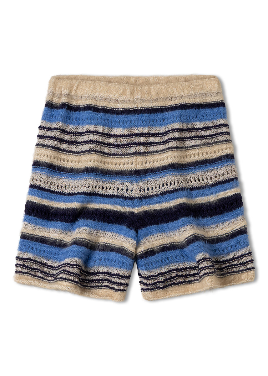 Lana Grossa Finito (73% katoen, 27% polyamide, ca. 200 m/50 g), 150 (150 - 150) g in camel/crème (kl 26). Lana Grossa Per Fortuna (74% katoen, 26% polyamide, ca. 150 m/50 g), 100 (100 - 150) g in viooltjesblauw (kl 62). Lana Grossa Filo Paillettes (55% katoen, 39% polyester, 6% polyamide, ca. 155 m/50 g), 100 (100 - 100) g in lichtbeige (kl 18). Lana Grossa Tencellino (51% linnen, 49% tencel, ca. 125 m/50 g), 150 (150 - 200) g in nachtblauw (kl 18). Breinld 4 mm. Ca. 75 (85 - 95) cm elastiek, 3 cm breed.