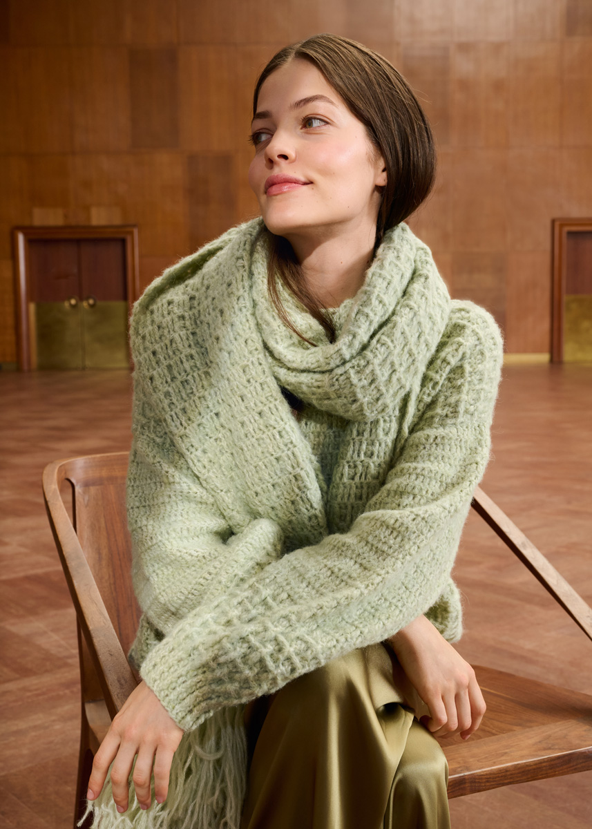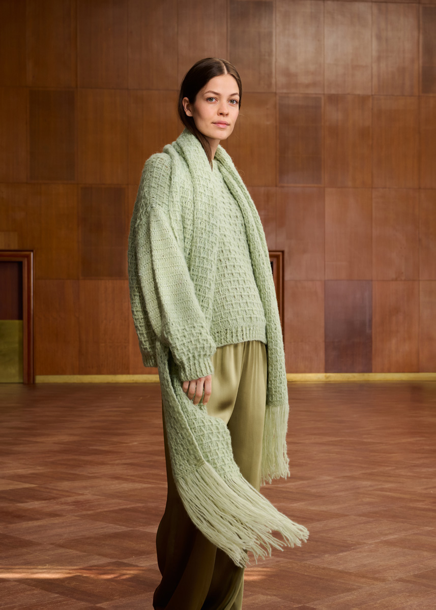 Lana Grossa Airy (42% alpaca (baby), 40% katoen, 18% scheerwol (merino extrafijn), ca. 170 m/50 g), 300 g witgroen (kl 19); 1 haaknld 4,5 mm.