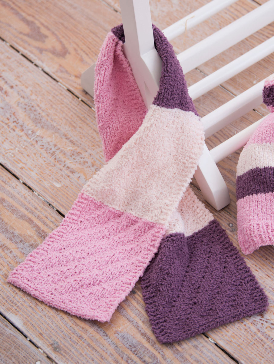 Zodra in de herfst de temperaturen dalen is het weer tijd voor mutsen en sjaals. Hoe vindt onze kleine meid de muts in kleurenmix met bonte pompon? Met een passende sjaal in dezelfde kleuren met schuin verlopend recht-/averecht-patroon.