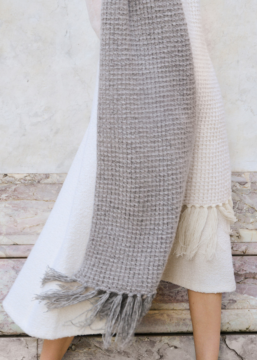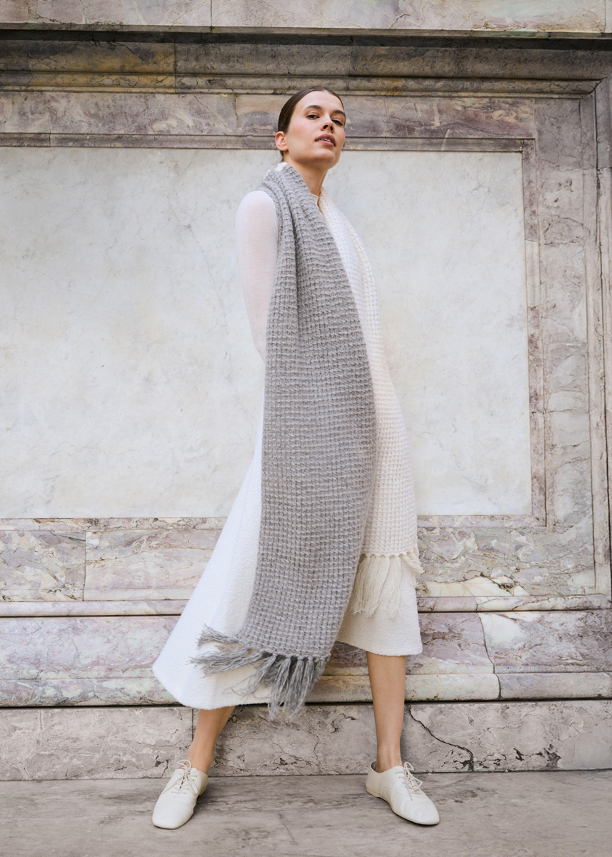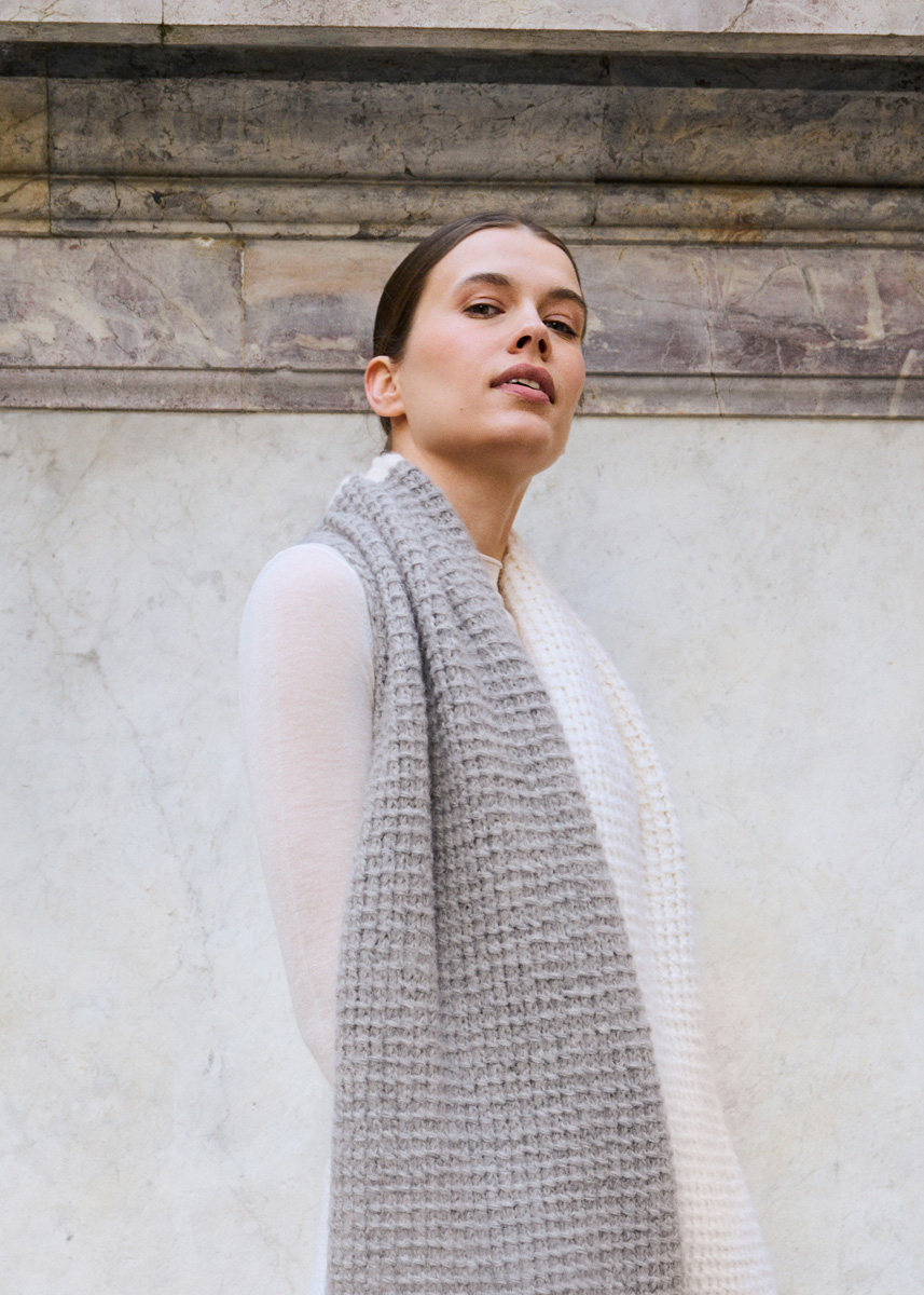 Lana Grossa-garen ‘Cashmere 16 Fine’ (80% scheerwol (merino), 10% kasjmier, 10% polyamide, ca. 320 m/50 g): ca. 100 g gebroken wit (kl 9) en ca. 100 g lichtgrijs (kl 15); Lana Grossa-garen ‘Setasuri’ (69% alpaca (suri), 31% zijde, ca. 212 m/25 g): ca. 125 g wit (kl 1) en ca. 125 g lichtgrijs (kl 19); breinld 7 mm; 1 haaknld 7 mm.
