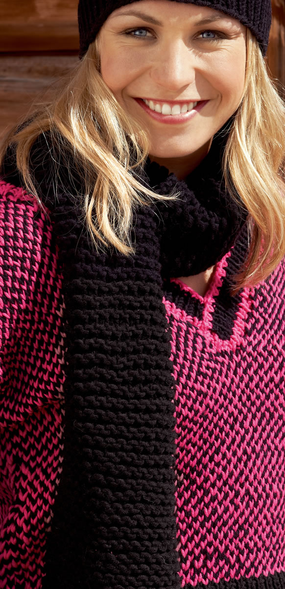 MET CONTRASTEFFECT Als je zwart als basiskleur neemt, kun je met allerlei felle kleurtjes contrast aanbrengen. Maak de trui met minimotiefje, de effen sjaal en de bonte muts met reusachtige pompon. (ca. 165 x 23 cm)