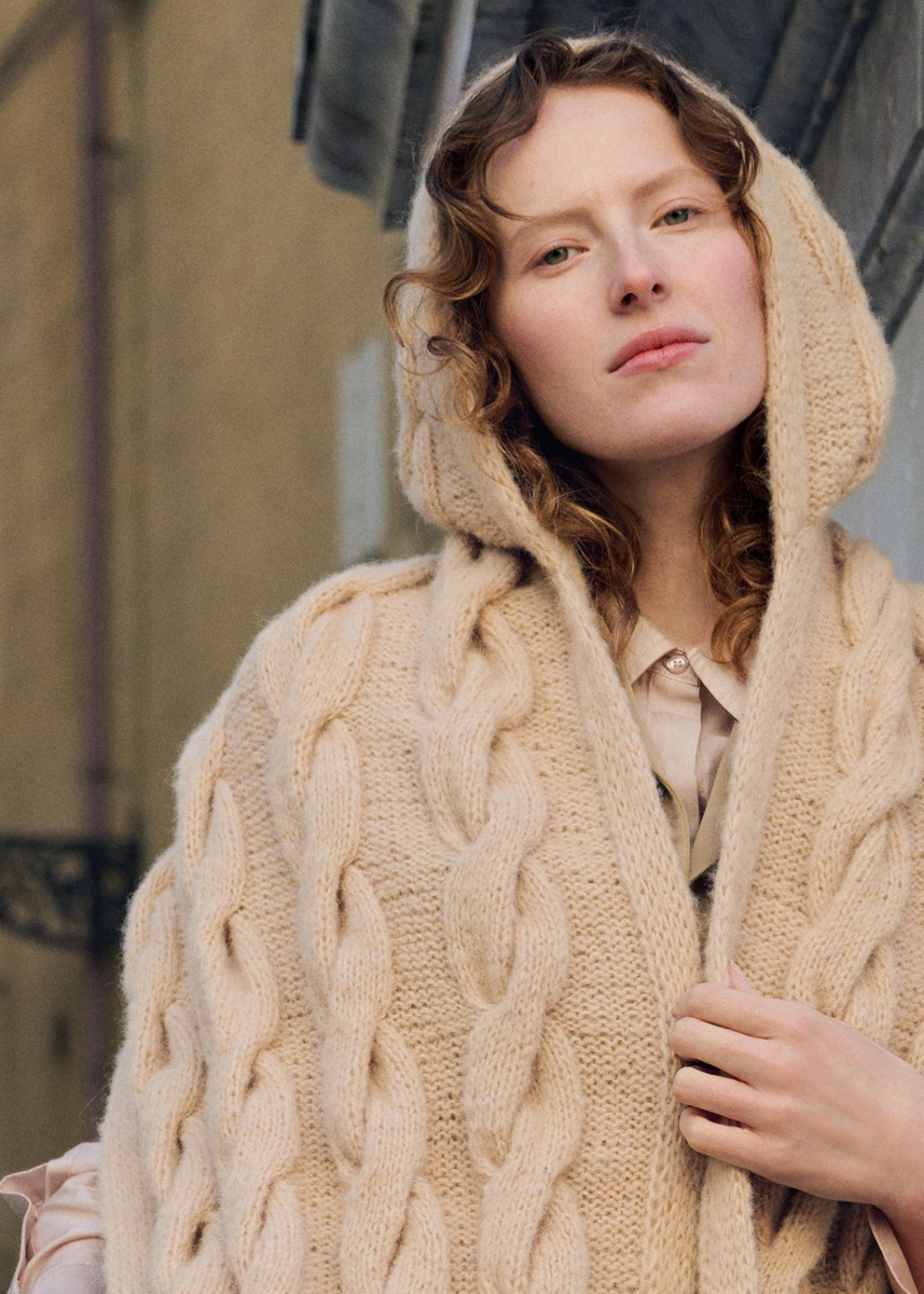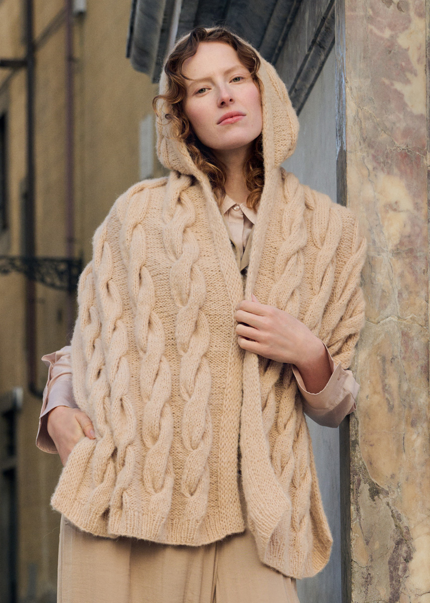 Lana Grossa-garen ‘Nebbia’ (55% scheerwol (merino extrafijn), 45% alpaca (baby), ca. 170 m/50 g): 400 g beige (kl 13); breinld 4 mm en 6; kabelnaald; markeerringen
