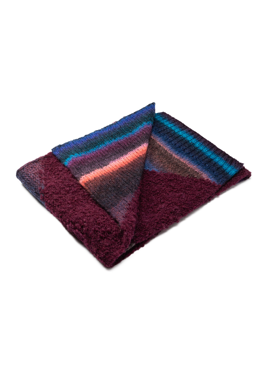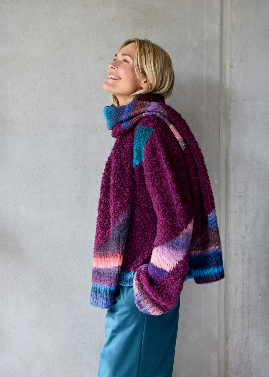 Lana Grossa-garen ‘Orsetto’ (60% scheerwol (merino), 40% alpaca (superfijn), ca. 75 m/50 g): ca. 150 g Bourgondisch rood (kl 5) en Lana Grossa-garen ‘Bomba’ (85% scheerwol (merino extrafijn), 15% polyamide, ca. 290 m/100 g): ca. 100 g zalm/grijsrood/donkerviolet/ turkooisblauw/blauwpetrol/koningsblauw (kl 3); breinld 4 mm en 6 mm.