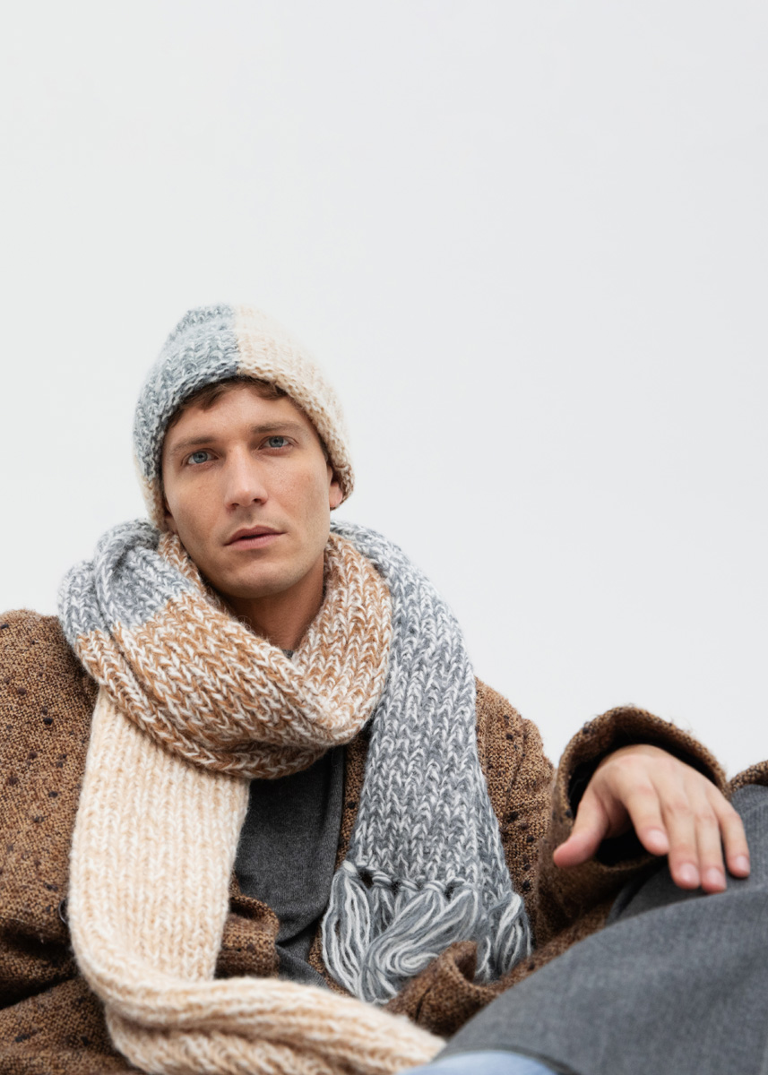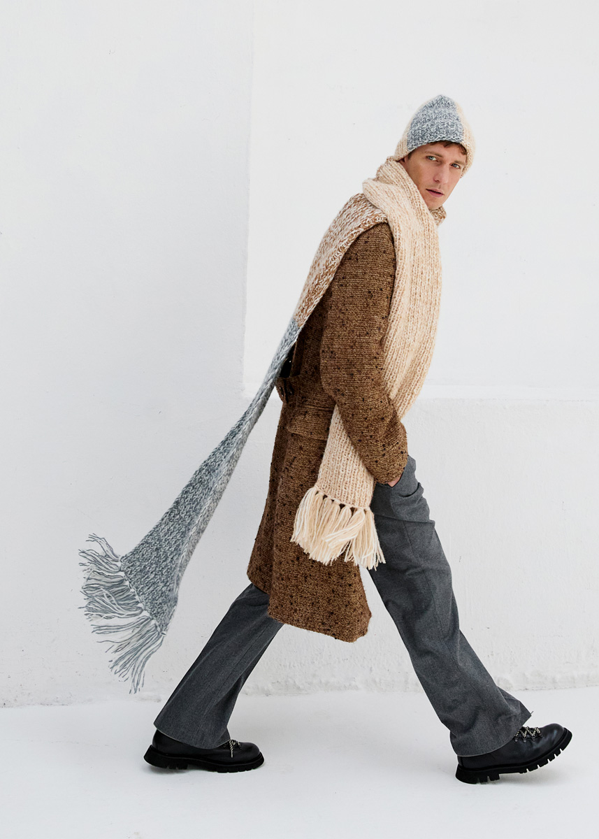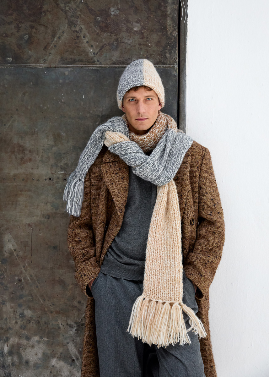 Lana Grossa ‘Nebbia’ (55% scheerwol (merino extrafijn), 45% (baby) alpaca, ca. 170 m/50 g): 200 g gebroken wit (kl 15), 100 g donkergrijs (kl 7), camel (kl 12) en beige (kl 13); breinld 8 mm en haaknld 8 mm