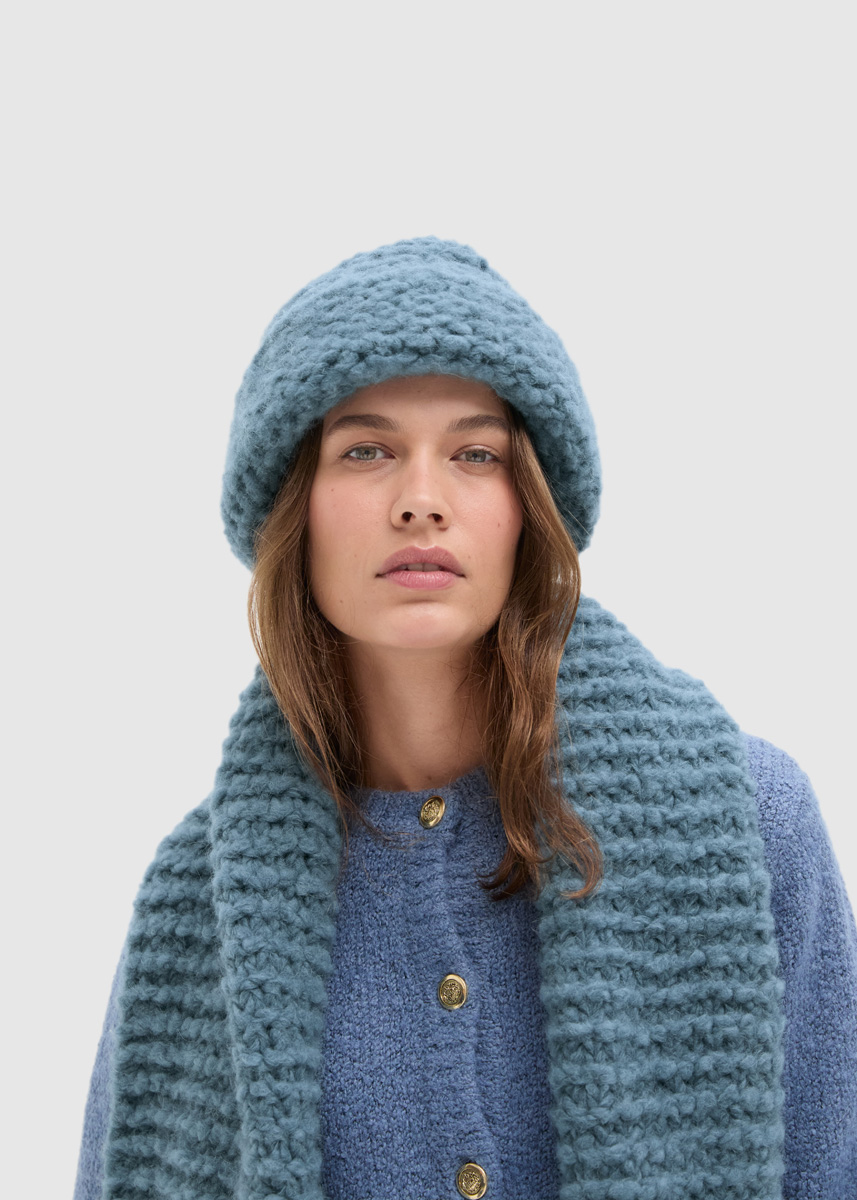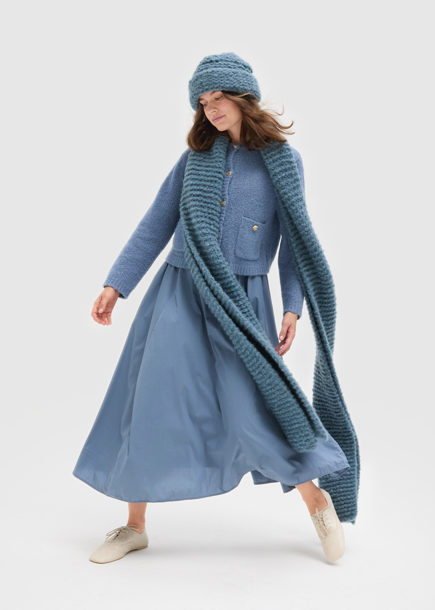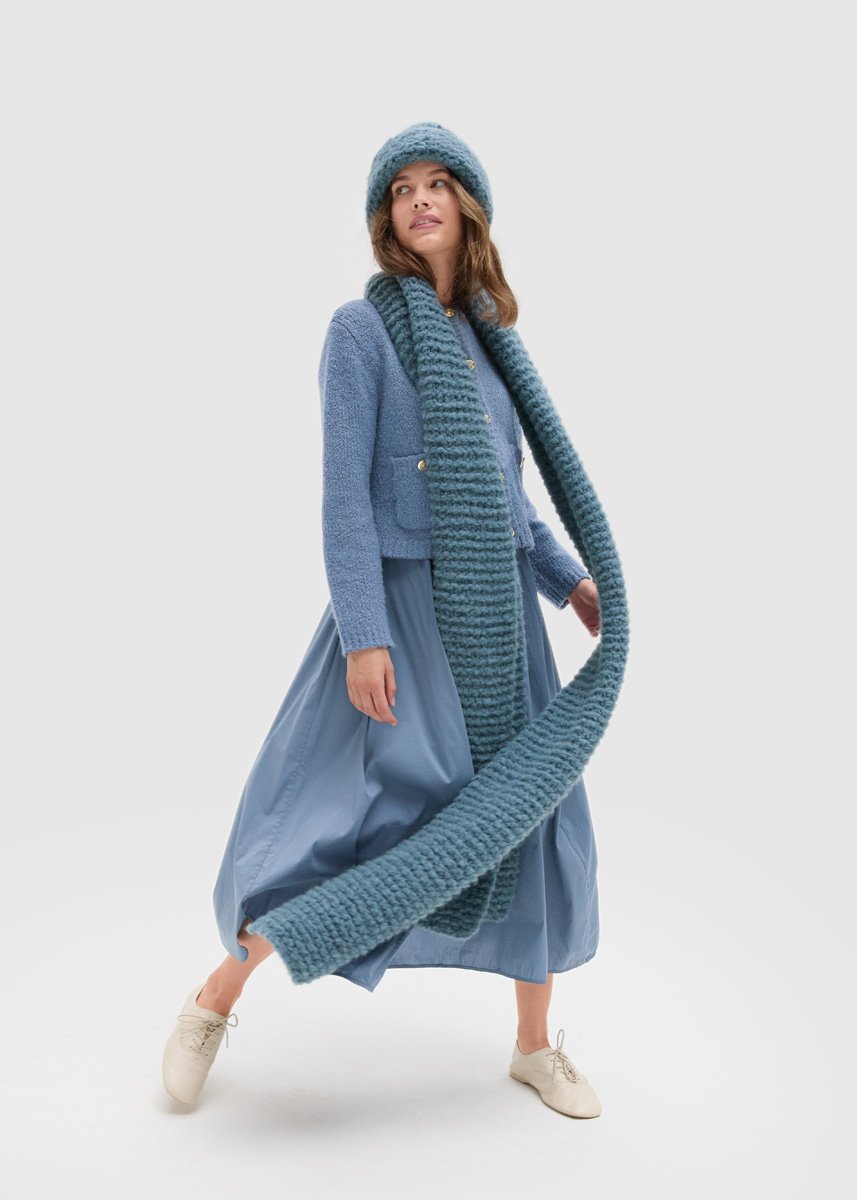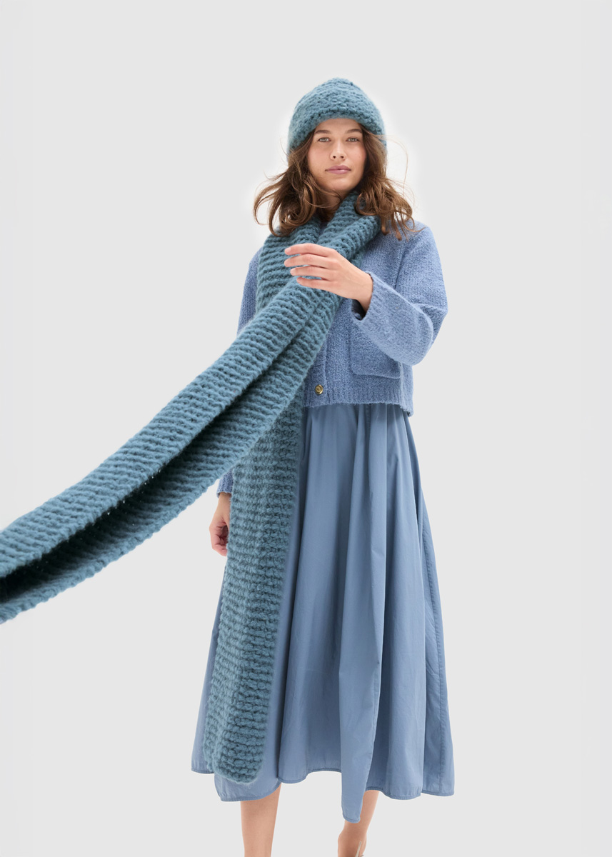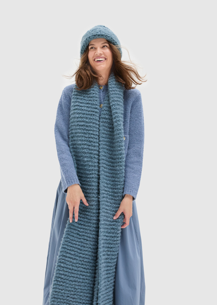 Lana Grossa ‘Royal Alpaca’ (93% alpaca (royal), 7% polyamide, ca. 95 m/50 g): 450 g grijsblauw (kl 17); rondbreinld 9 mm.