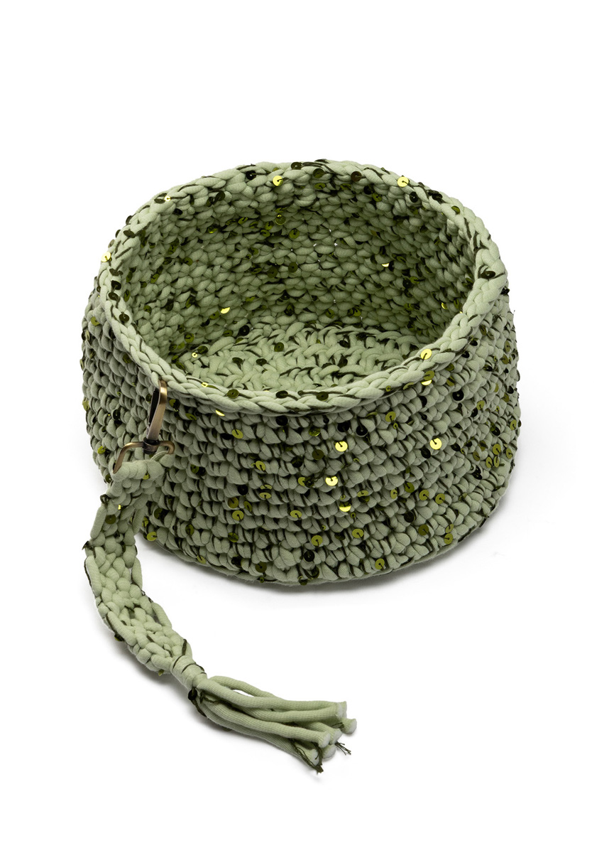 Lana Grossa-garen ‘The Tube’ (60% katoen, 40% nylon, ca. 114 m/200 g): 1 restje resp. 6 m witgroen (kl 31) en Lana Grossa-garen ‘Cosmo’ (100% katoen (plus pailletten), ca. 260 m/100 g): 1 restje resp. 6 m donkerolijf (kl 22), beide restjes van sjaal model 51; 1 schaar; 1 karabijnhaakje, bv. 1 metalen karabijnhaakje van Belle Vous in bronskleur, 26 mm breed, 60 mm lang (via Amazon); stevig plakband om karabijnhaakje en spelden vast te zetten.