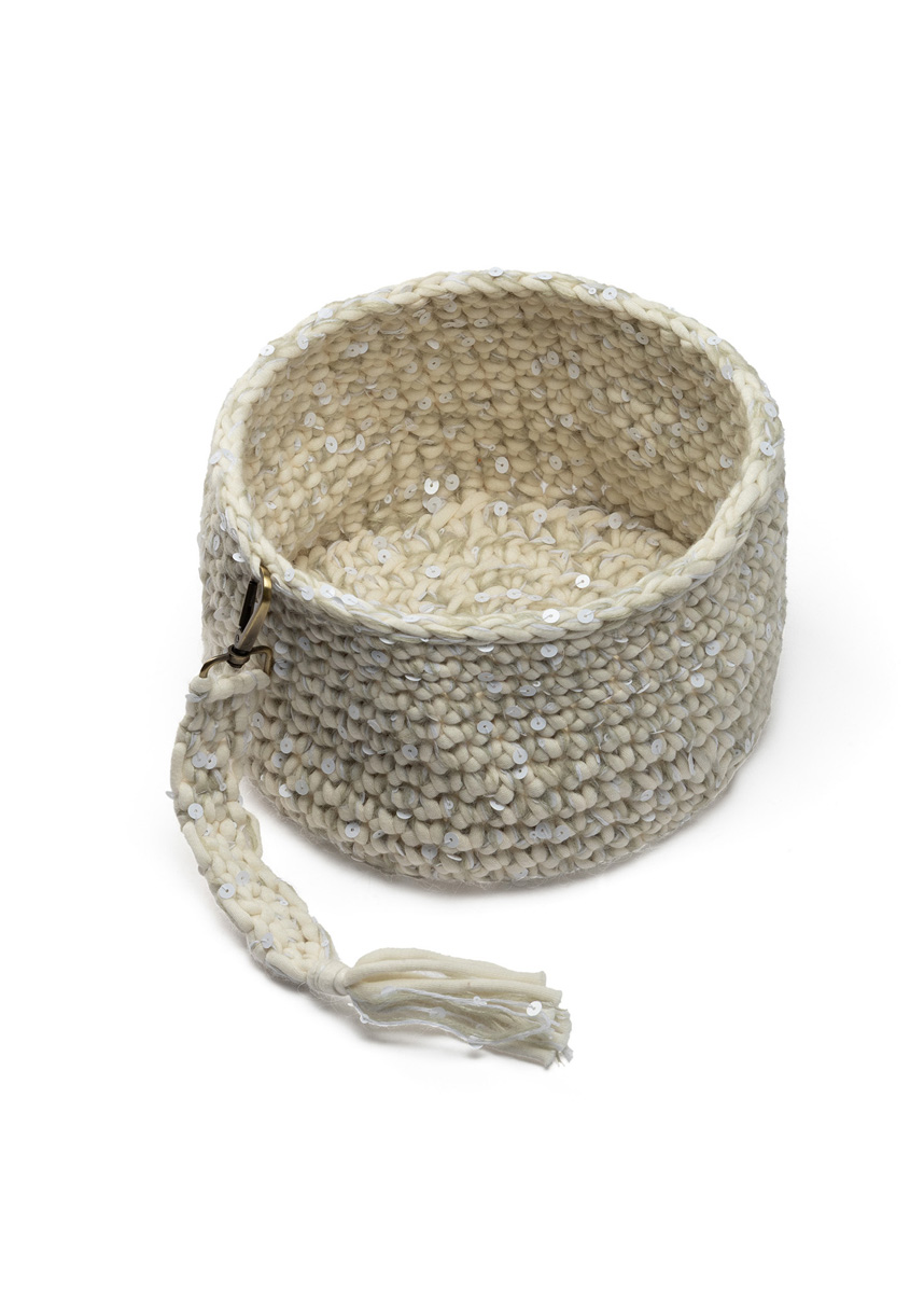 Lana Grossa-garen ‘Cosmo’ (100% katoen (plus pailletten), ca. 260 m/100 g): 1 restje resp. 6 m nachtblauw (kl 19), Sleutelhanger B: Lana Grossa-garen ‘The Tube’ (60% katoen, 40% nylon, ca. 114 m/200 g): 1 restje resp. 6 m crème (kl 2), Lana Grossa-garen ‘Setasuri’ (69% alpaca (suri), 31% zijde, ca. 212 m/25 g): 1 restje resp. 12 m groenbeige (kl 52) en Lana Grossa-garen ‘Cosmo’ (100% katoen (plus pailletten), ca. 260 m/100 g): 1 restje resp. 6 m wit (kl 1); restjes van de manden model 53;