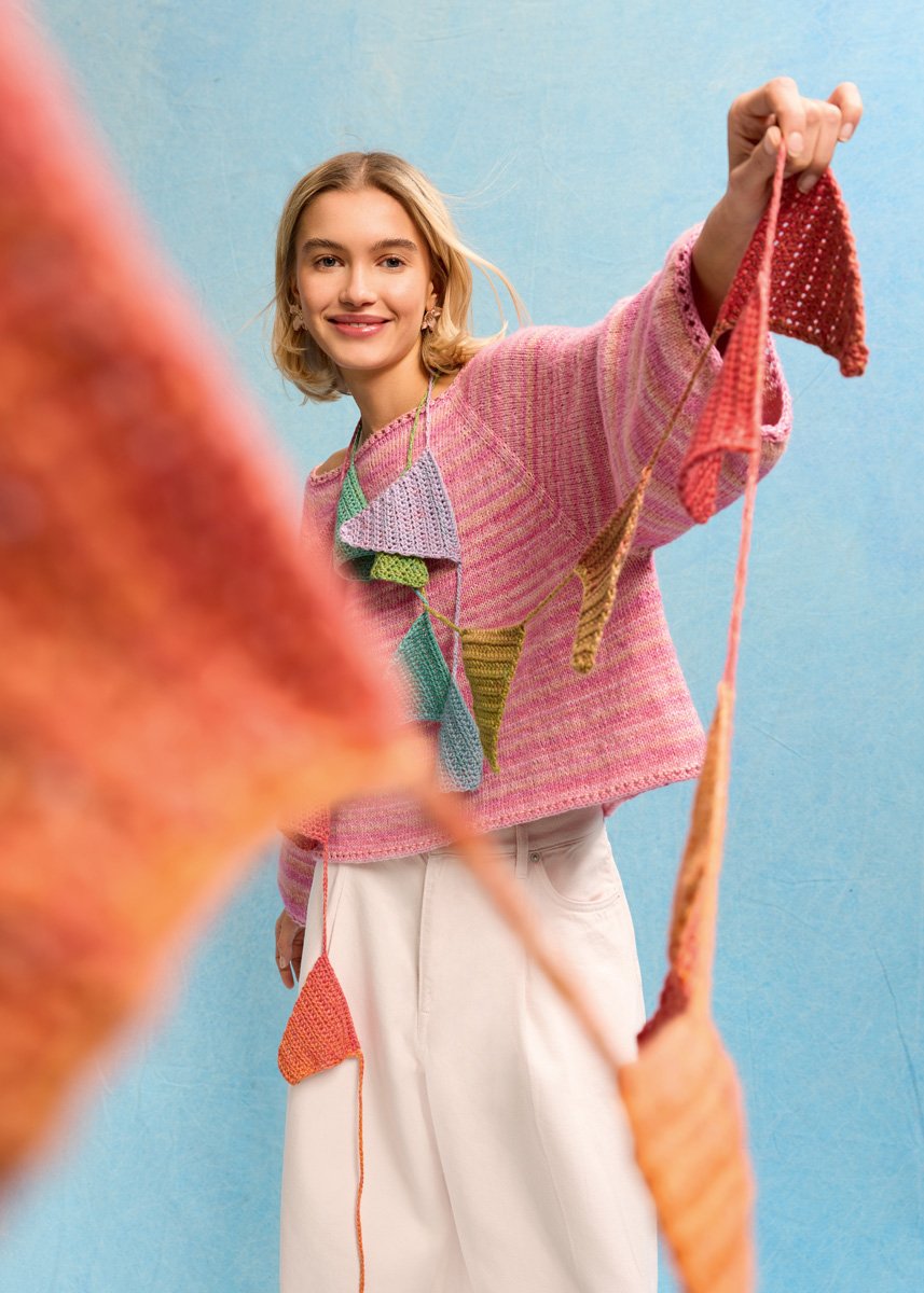 Lana Grossa-garen ‘Cotonella’ (100% katoen (Pima), ca. 280 m/100 g): ca. 1 bolletje = ca. 100 g sering/ lichtblauw/turquoisegroen/mosterd/tomaat/framboos/oranje/ zalm (kl 11); 1 haaknld 4,5 mm.