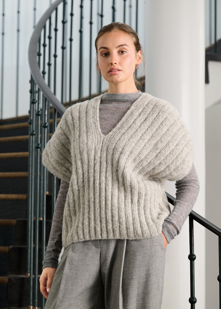 Lana Grossa Airy (42% alpaca (baby), 40% katoen, 18% scheerwol (merino extrafijn), ca. 170 m/50 g) 250 (300 – 350) g witgrijs (kl 12); breinld 3,5 mm en 4.