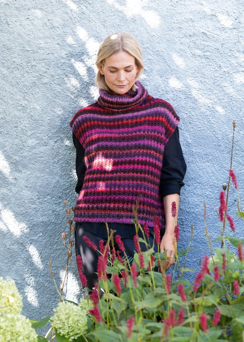 Lana Grossa Bomba (85% scheerwol (merino extrafijn), 15% polyamide, ca. 290 m/100 g), 200/300 g kl 2; rondbreinld 5 mm, lengte 40 cm en 80 cm; rondbreinld 6 mm, lengte 40 cm en 80 cm; eventueel breinld zonder knop 5 mm en 6 mm; borduurnaald; 2 markeerringen