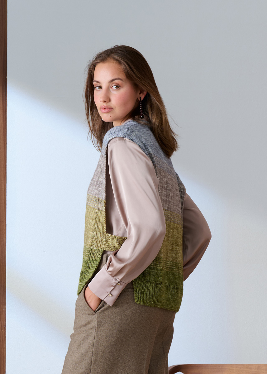 Lana Grossa Brigitte Silkdream (60% scheerwol (merino fijn), 30% zijde, 10% mohair (superkid), ca. 270 m/50 g), 50 (100 – 100) g olijf (kl 7), 50 (100 – 100) g kaki (kl 6), 50 (100 – 100) g grijsbeige (kl 4) en 50 (100 – 100) g grijs (kl 15); 1 rondbreinld 4 mm (60 cm lang), 1 rondbreinld 3,5 mm (40 cm lang).