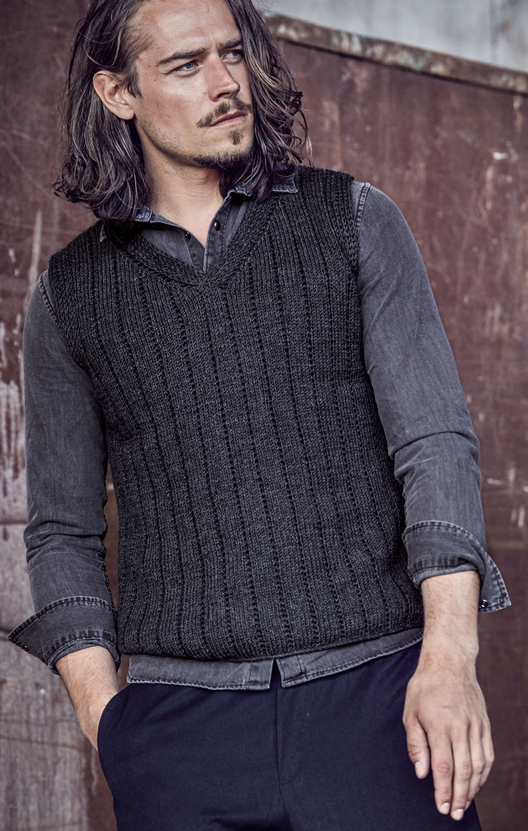 “Cool Wool Big” (100% scheerwol, looplengte 120 m/50 g) van Lana Grossa: 350 (400-450) g antraciet (kl. 618); breinaalden nr. 4