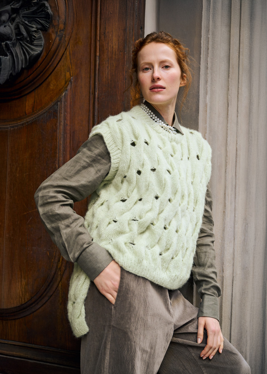 Lana Grossa-garen ‘Nebbia’ (55% scheerwol (merino extrafijn), 45% alpaca (baby), ca. 170 m/50 g): 350 (400 - 450) g witgroen (kl 9); breinld 4,5 mm en 6; 1 korte rondbreinld 4,5 mm; 1 kabelnaald