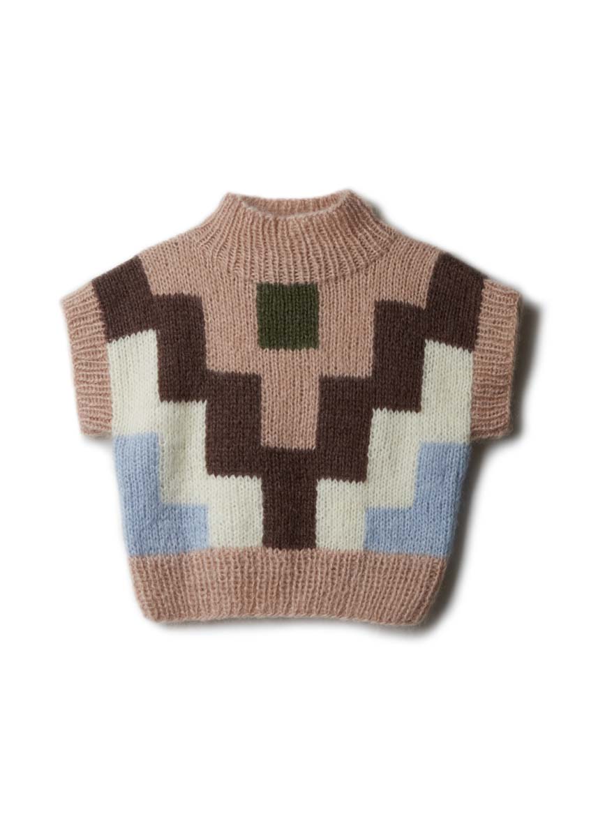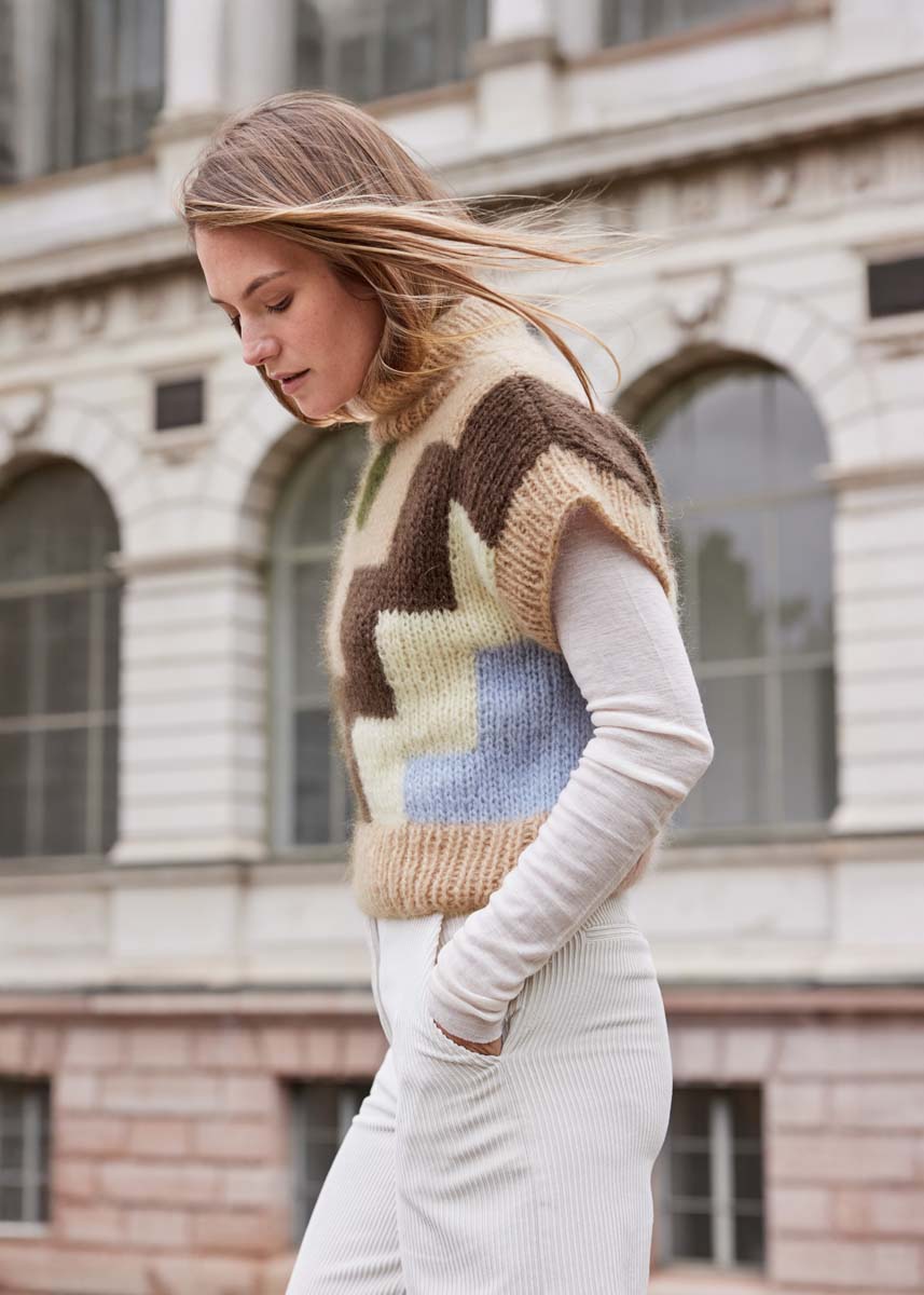 Lana Grossa Mohair di Gio (55% mohair (superkid), 45% scheerwol (merino superfijn), ca. 85 m/50 g), 150 g beige (kl 8), 100 (150 - 150) g grijsbruin (kl 7), 100 g pastelblauw (kl 10), 100 g gebroken wit (kl 9), en 50 g vaarngroen (kl 14); breinld 6 mm en 7 mm; een 60 cm lange rondbreinld 6 mm.