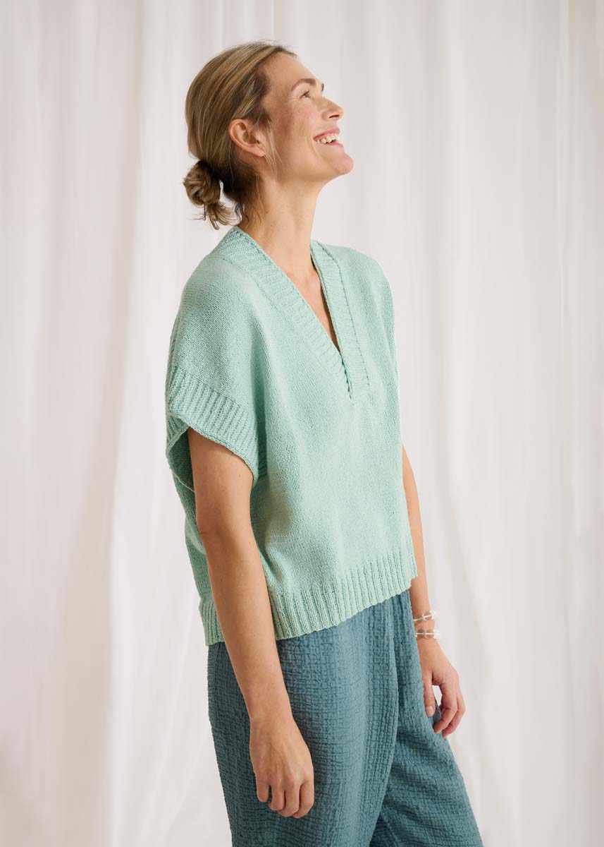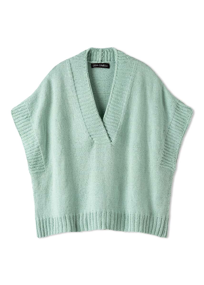 Lana Grossa Summer Cashmere (90% katoen, 10% kasjmier, looplengte 210 m/50 g), 300 (350 – 400 – 450) g mint (kl. 12); breinaalden nr. 2,5 en 3.