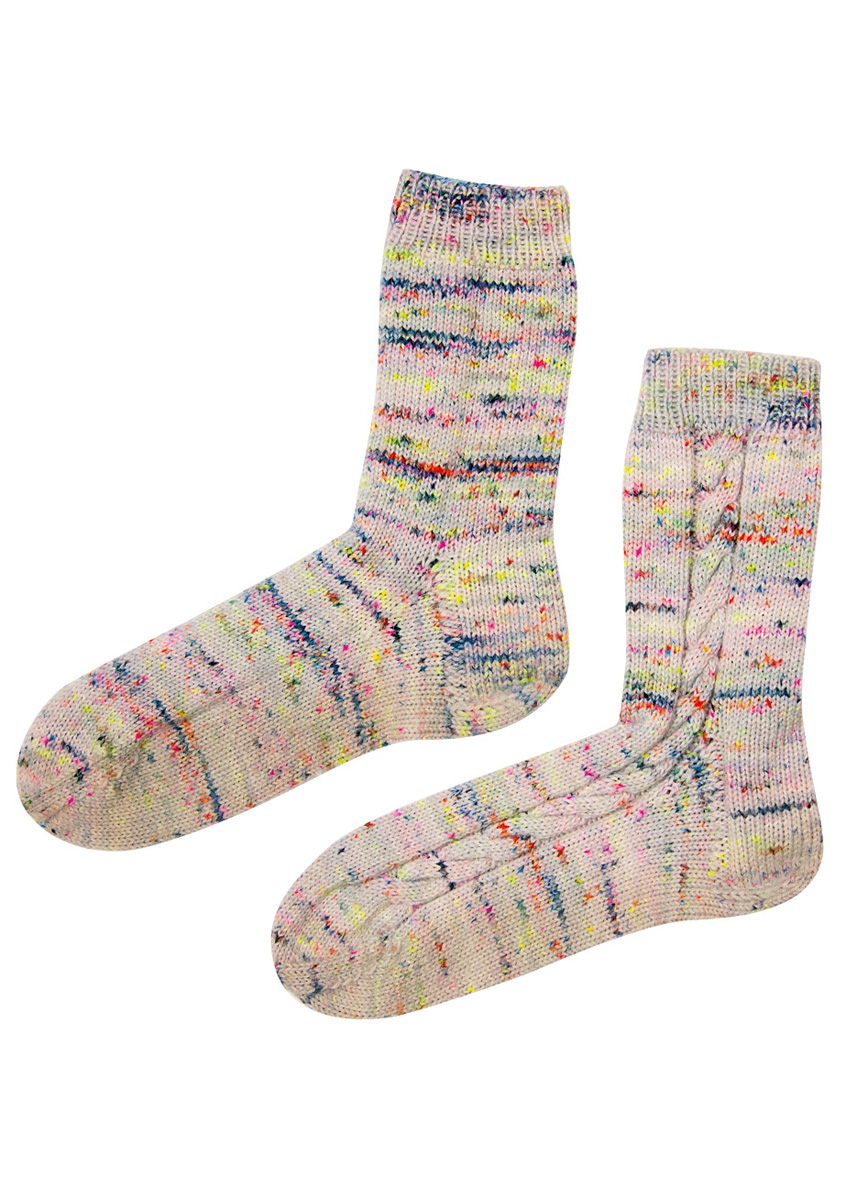Lana Grossa Meilenweit Merino hand-dyed (80% merinoswol, 20% polyamide, looplengte 420 m/100 g), 100 g licht-grijs/geelgroen/ pink/donkerpetrol/zwartgroen (kl. 302); sokkennaalden nr. 3 en 1 kabelnaald