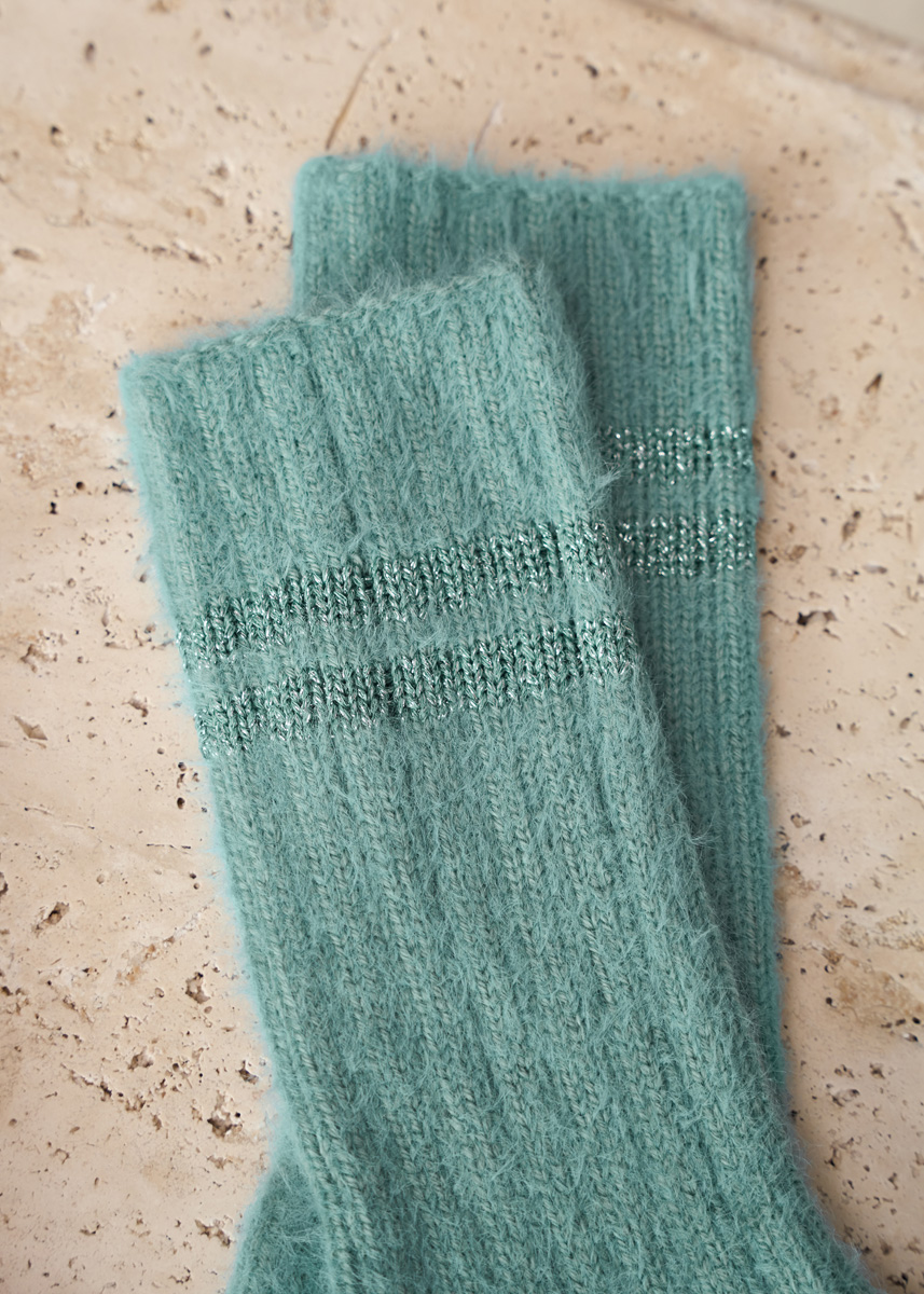Variant B: Lana Grossa- garen Cosy Socks (70% scheerwol (merino), 30% polyamide, ca. 400 m/100 g): 100 g roze (kl 1) en Brillino (83% viscose, 17% metallic vezels ca. 200 m/25 g): 25 g wit/roze (kl 8); variant C: Lana Grossa- garen Cosy Socks (70% scheerwol (merino), 30% polyamide, ca. 400 m/100 g): 100 g saliegroen (kl 6) en Brillino (83% viscose, 17% metallic vezels ca. 200 /25 g): 25 g turquois/zilver (kl 36).