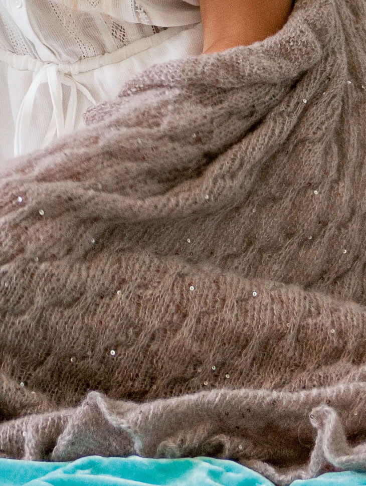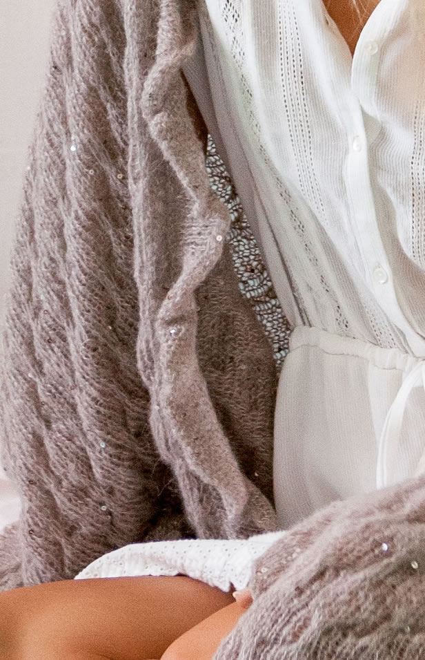 ca. 250 g „Lace Paillettes“ (45% (baby) alpaca, 20% scheerwol (merinoswol), 15% polyamide, 15% katoen, 5% polyester, ll. = 150 m/25 g) van Lana Grossa in taupe (kl. 2); telk. 1 rondbreinld. nr. 4, 80 en 120 cm lang; 1 haaknld. nr. 3,5.