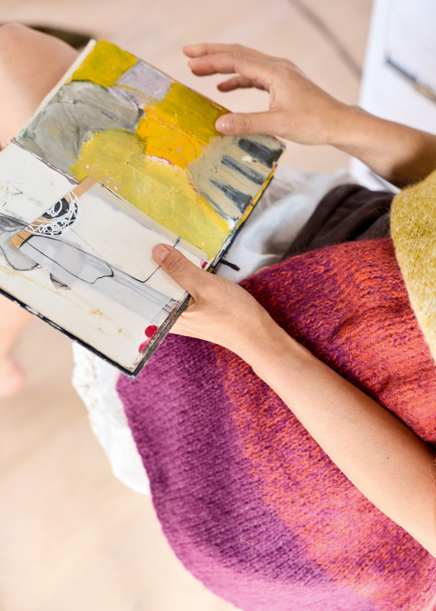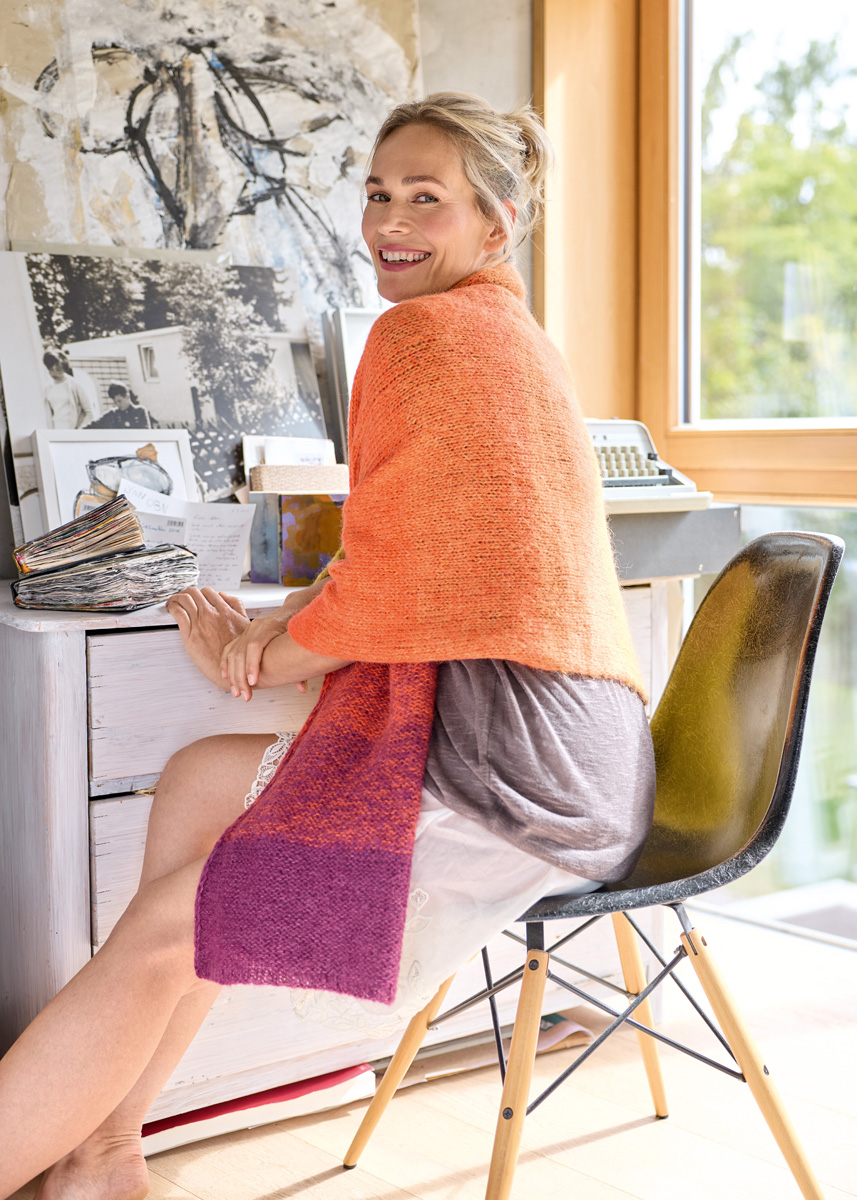 Lana Grossa-garen ‘Setasuri’ (69% alpaca (suri), 31% zijde, ca. 212 m/25 g): ca. 75 g bordeaux (kl 31), kreeftrood (kl 23), roestoranje (kl 63), honinggeel (kl 65) en lichtbeige (kl 58); 1 rondbreinld 6,5 mm, 80 cm lang.