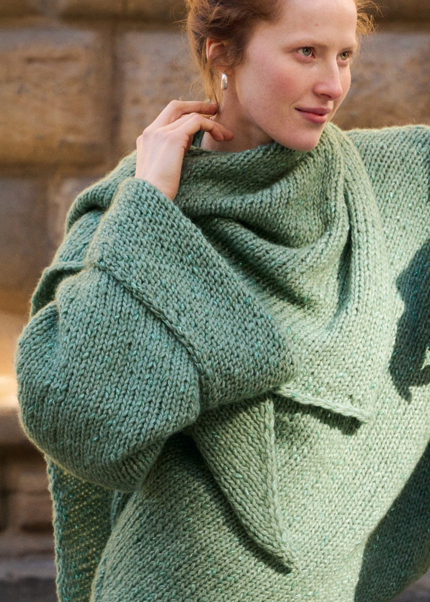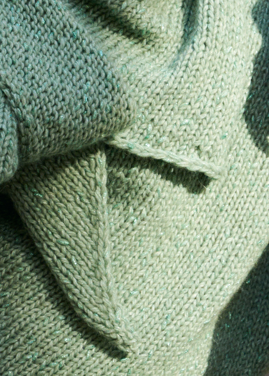 Lana Grossa-garen ‘Lucciola’ (29% polyamide, 24% scheerwol (merino fijn), 22% viscose, 20% alpaca (baby), 5% metallic vezels, ca. 130 m/50 g): ca. 300 g groen (kl 3); breinld 10 mm.