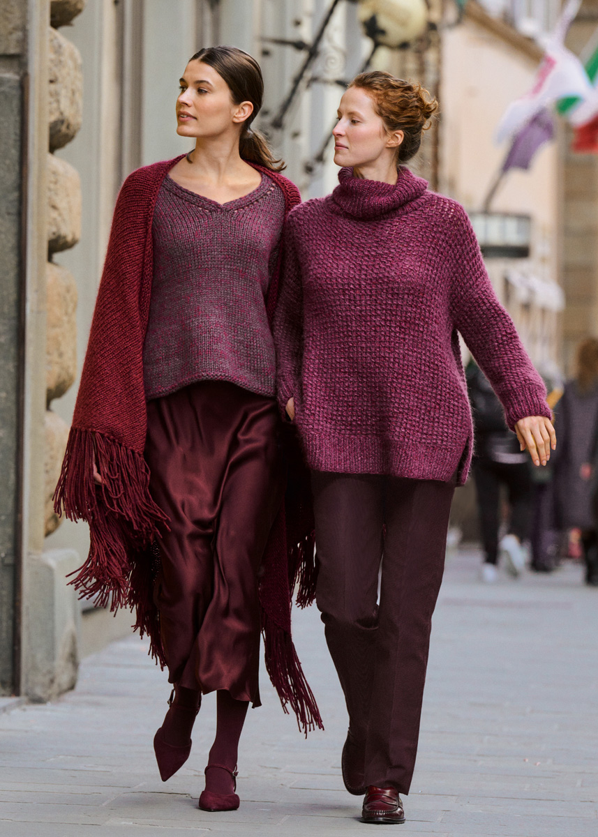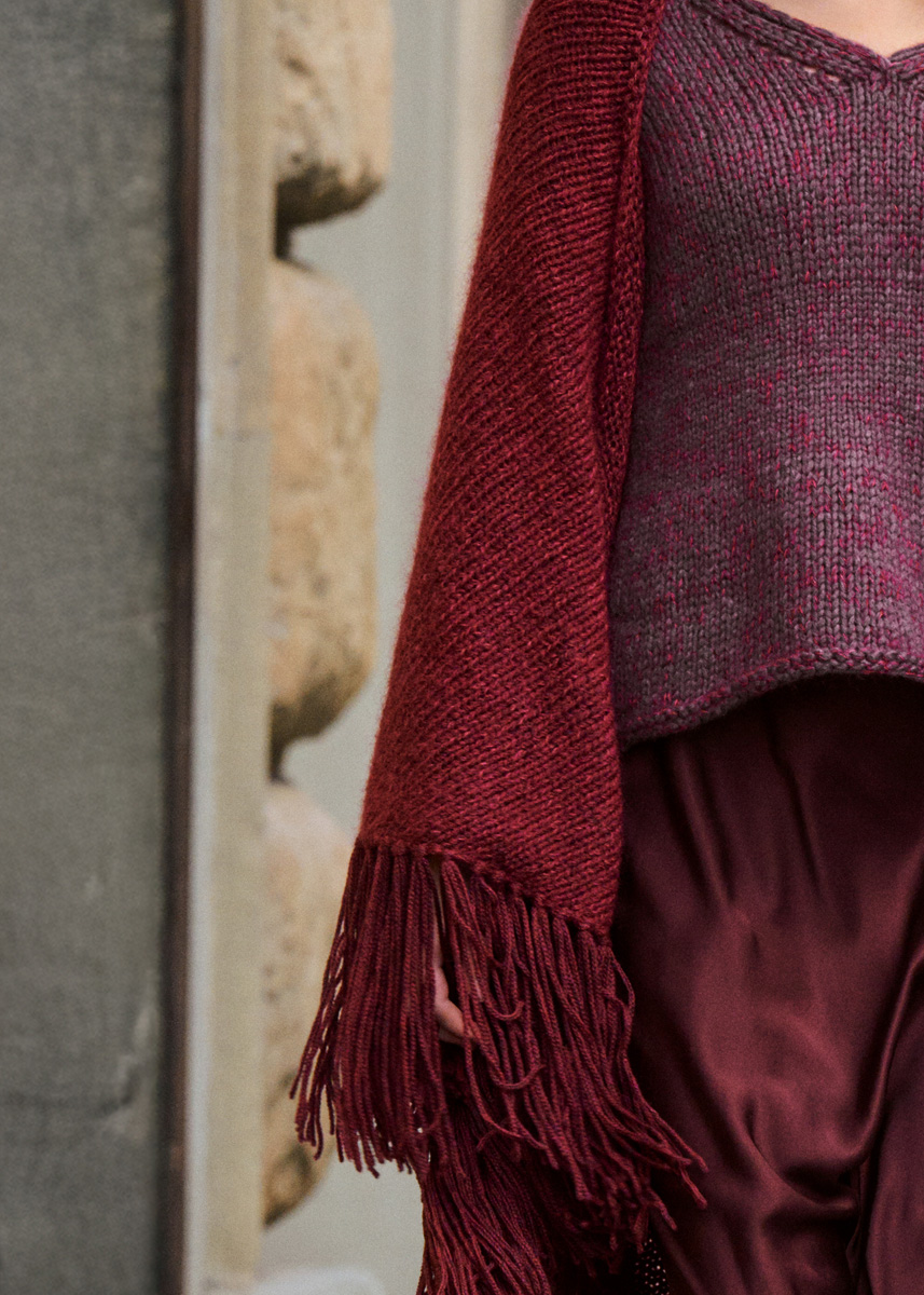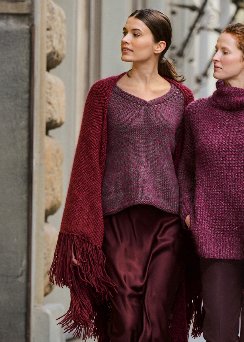 Lana Grossa-garen ‘Silkhair’ (70% mohair (superkid), 30% zijde, ca. 210 m/25 g): ca. 100 g bordeaux (kl 113); Lana Grossa- garen ‘Alta Moda Alpaca’ (90% alpaca (baby), 5% scheerwol (merino), 5% polyamide, ca. 140 m/50 g): ca. 500 g Bourgondisch rood (kl 94); lange rondbreinld 7 mm en 8 mm; 1 haaknld 7 mm.