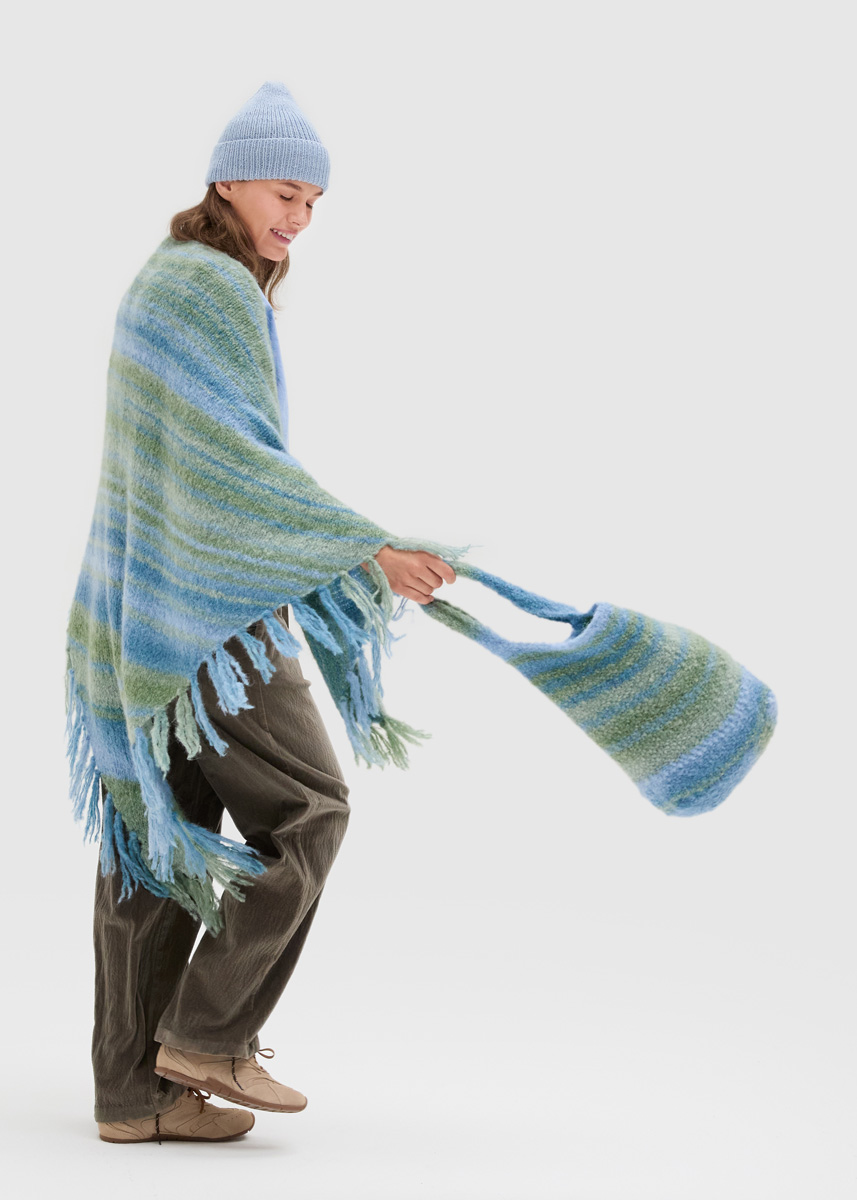 Lana Grossa ‘Gigante’ (70% alpaca (fijn), 30% polyamide, ca. 300 m/100 g): 100 g rietkleur-grijsgroen/ grijs-/rookblauw (kl 16); breinld 6 mm, hulpnld.