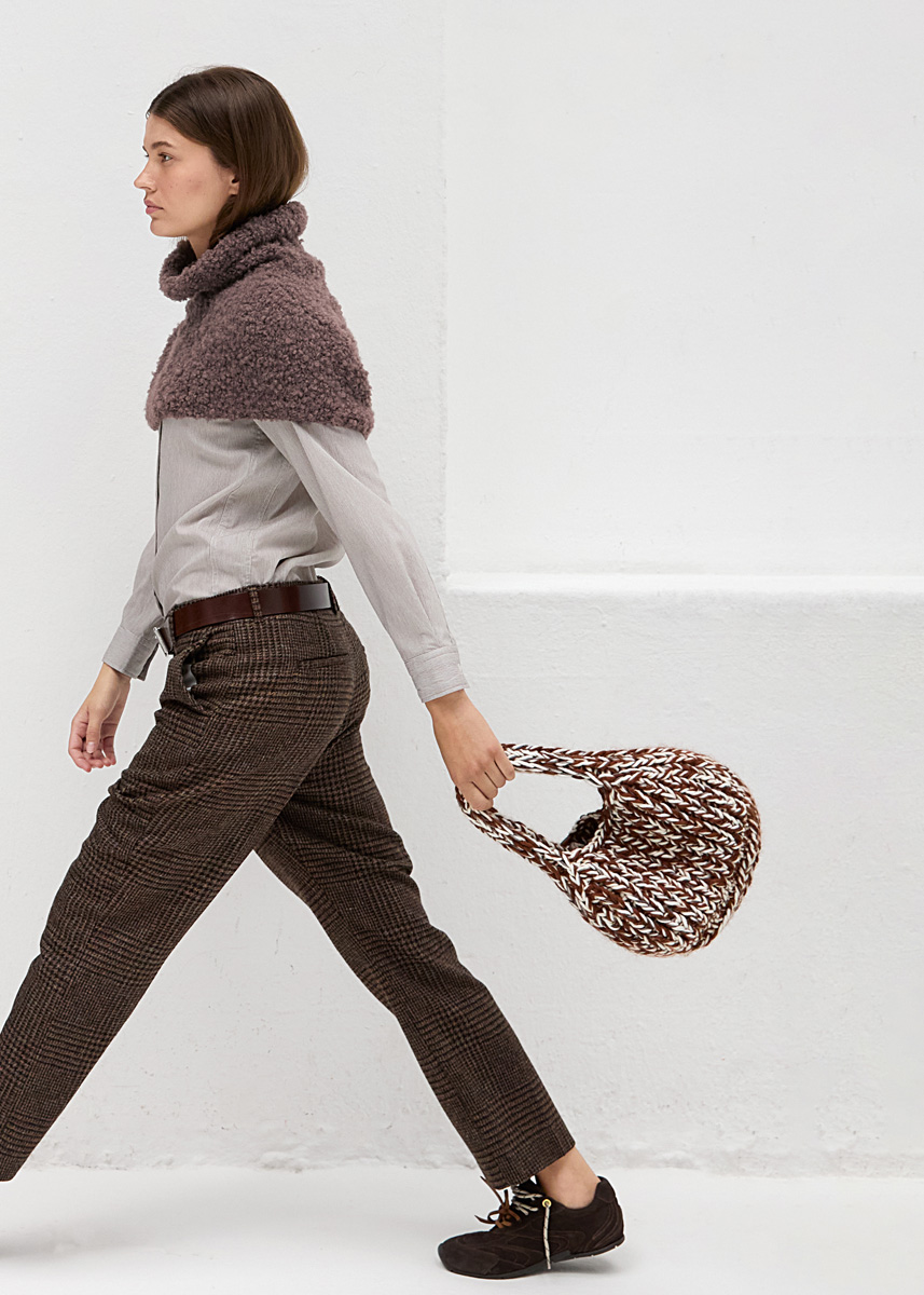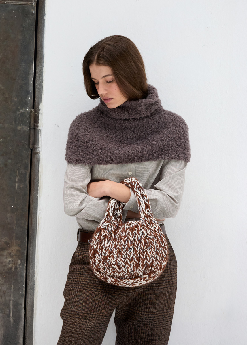 Lana Grossa ‘Mille II’ (50% scheerwol (merino), 50% polyacryl, ca. 55 m/50 g): 150 g gebroken wit (kl 17), Lana Grossa ‘Per Lei’ (100% scheerwol (merino), ca. 60 m/ 50 g): 150 g chocoladebruin (kl 47) en Lana Grossa ‘Cool Wool Vintage’ (100% scheerwol (merino extrafijn), ca. 160 m/50g): 50 g donkergrijs (kl 7391); rondbreinld 9 mm, hulpnld; markeerringen.