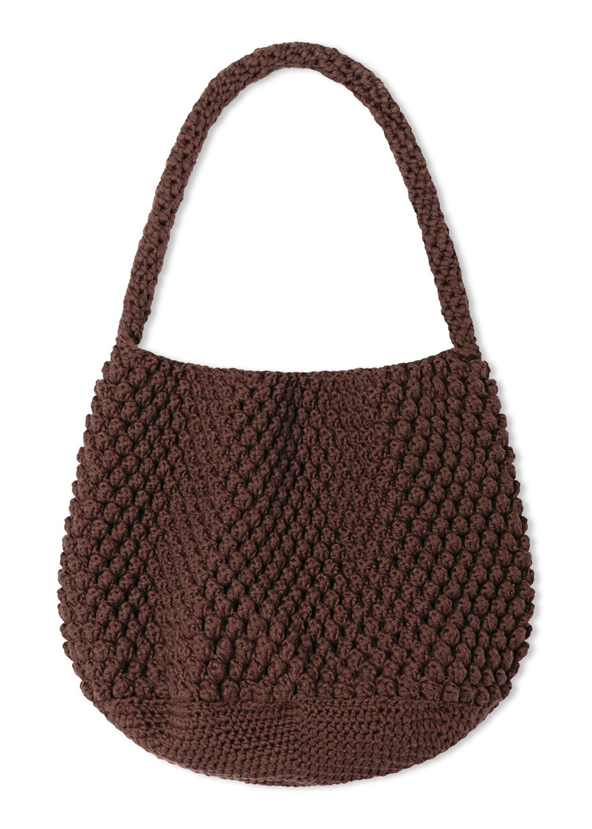 Lana Grossa-garen ‘Tessera’ (100% katoen, ca. 115 m/50 g): ca. 300 g donkerbruin (kl 17); 1 haaknld 3 mm en 5 mm.