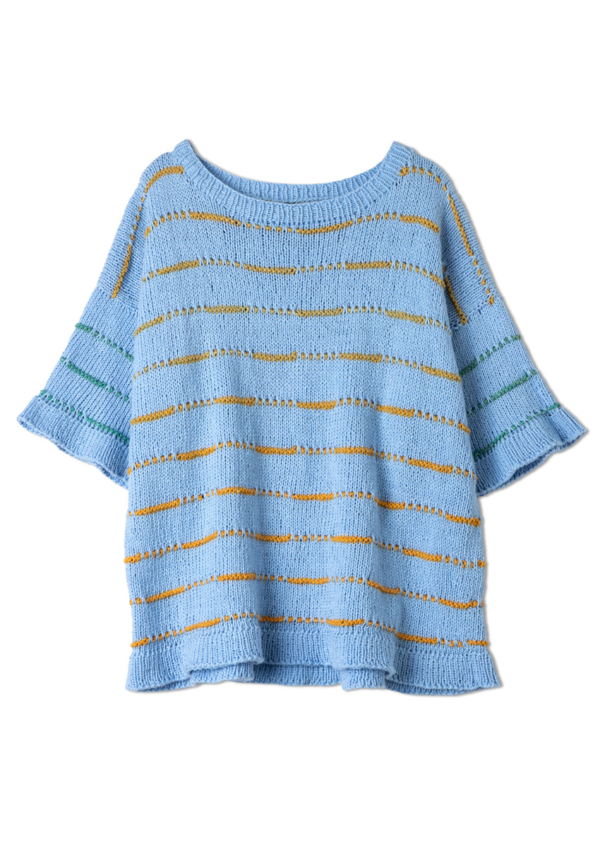 Lana Grossa Cotonella (100% (Pima) katoen, ca. 280 m/100 g), 300 (400 - 400) g in lichtblauw (kl 209) en 100 (100 - 100) g in grijsgroen/bruin/goud-/zonnegeel/pastelblauw/ perzik/groenbeige/turquois (kl 14); 1 rondbreinld 3 mm en 5 mm, 40 cm en 80 cm lang, 2 markeerringen