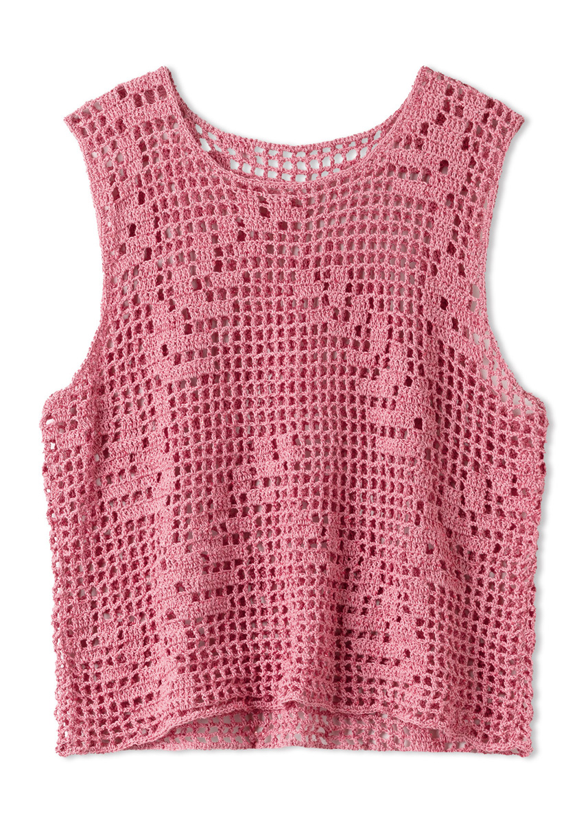Lana Grossa-garen ‘Filo Paillettes’ (55% polyester, 39% katoen, 6% polyamide, ca. 220 m/50 g): ca. 200 (250 - 250 - 300) g zalm (kl 6); haaknld 3 mm.