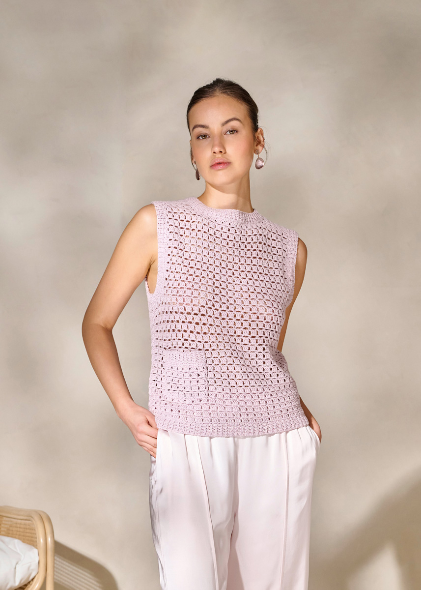 Lana Grossa Landlust Sommerseide (50% zijde, 50% katoen, ca. 170 m/50 g), 300 (350 – 400) g pastelroze (kl 65); 1 haaknld 3 mm en 3,5 mm.