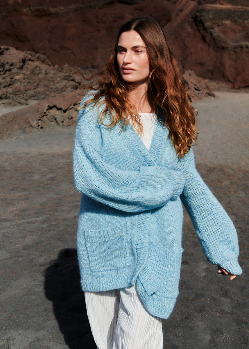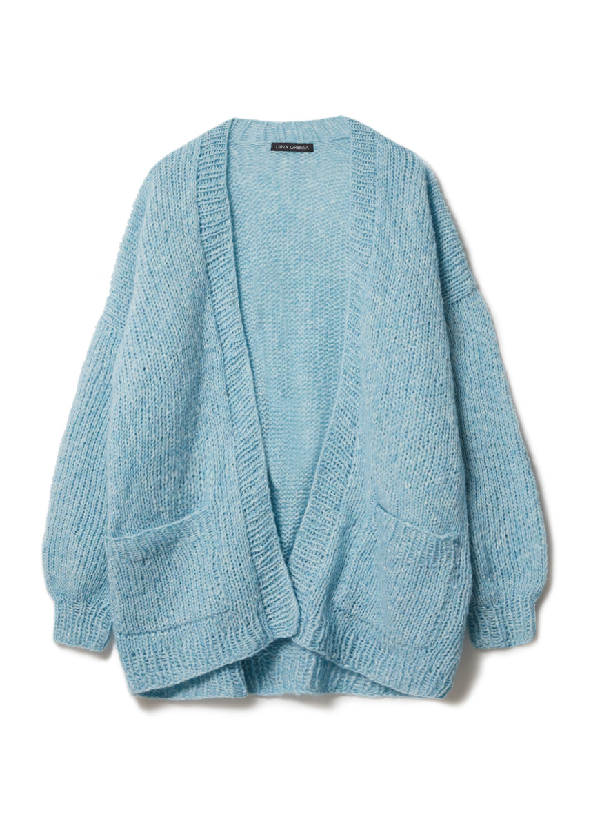 Lana Grossa Bella (35% katoen, 30% nylon, 25% alpaca (baby), 10% scheerwol (merino), ca. 250 m/25 g), 350 (375 – 400 – 425) g aquamarine (kl 22); breinld 6 en 7 mm; rondbreinld 7 mm, 60 cm lang, 2 hulpnld; haaknld 6 mm; eventueel knopen
