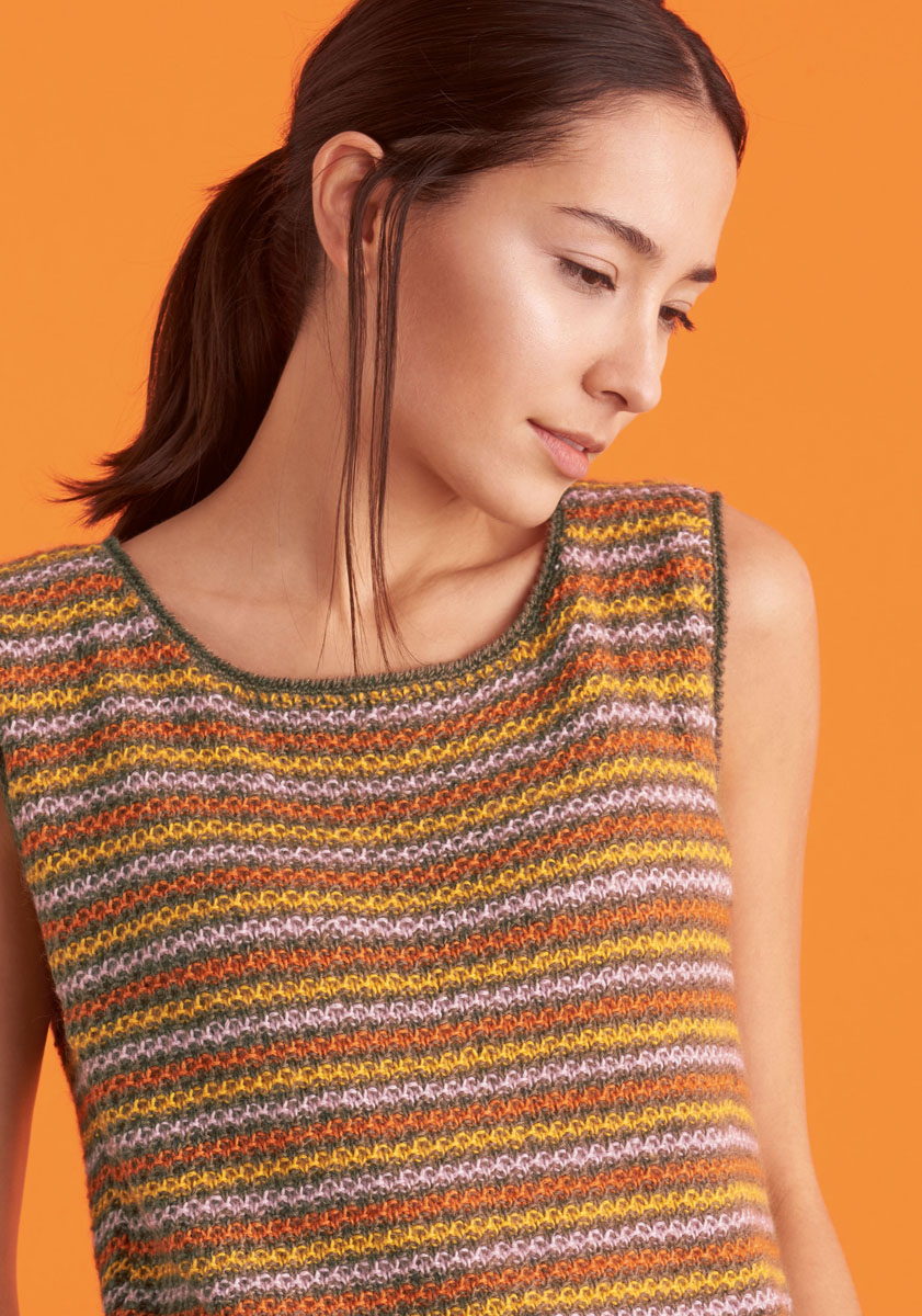 “Ecopuno” (75% katoen, 15% scheerwol, 10% alpaca, looplengte 225 m/50 g) van Lana Grossa: 150 (200/250) g donkerbruin (kl. 17), 50 (100/100) g jaffa-oranje (kl. 5), 50 (100/100) g sering (kl. 8) en 50 (100/100) g geel (kl. 4); breinaalden nr. 4; haaknaald nr. 3,5