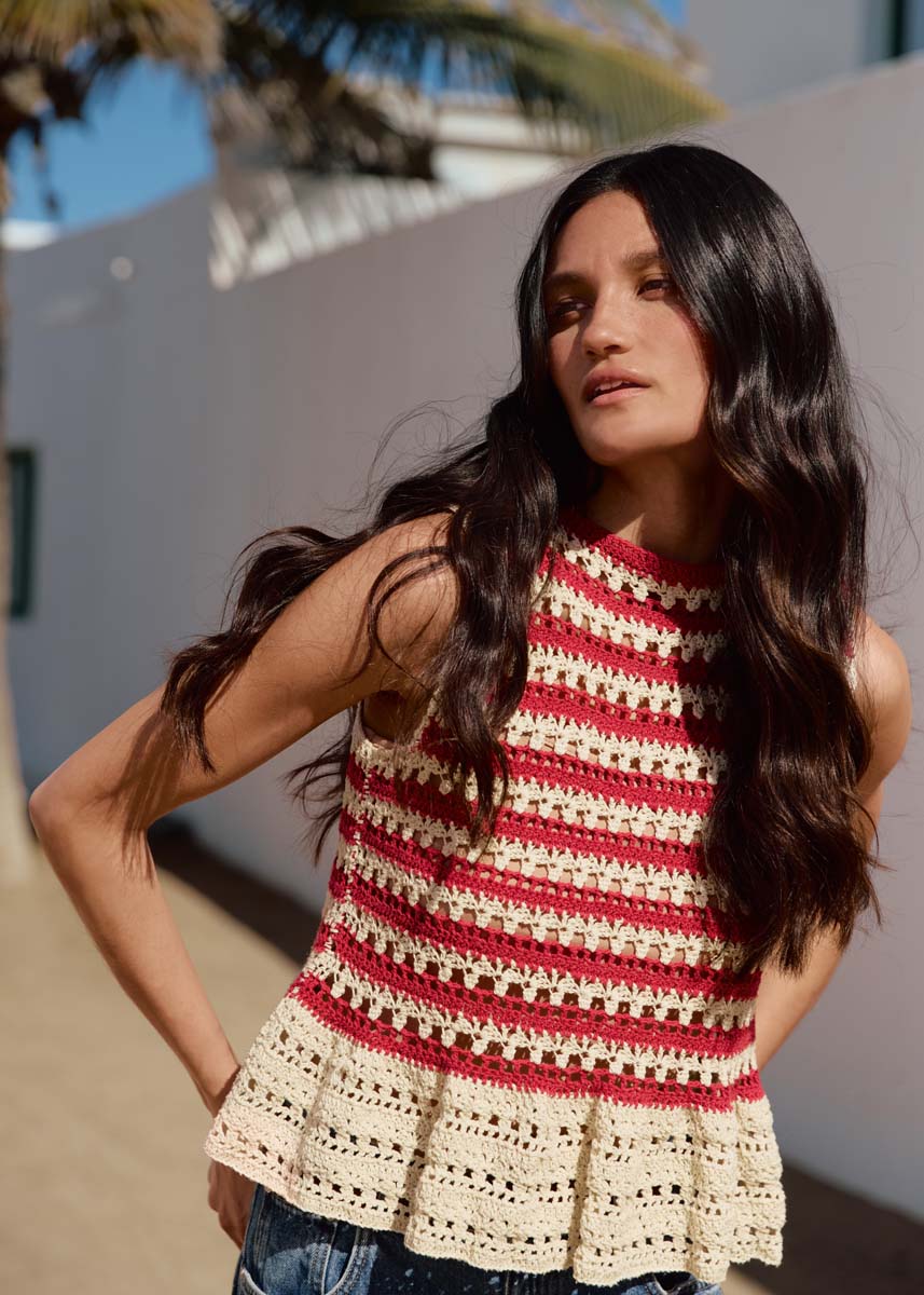 Lana Grossa-garen ‘Setapura’ (100% zijde, ca. 200 m/50 g): ca. 200 (200 – 250) g crème (kl 15) en ca. 100 (100 – 150) g rood (kl 9); 1 haaknld 3,5 mm