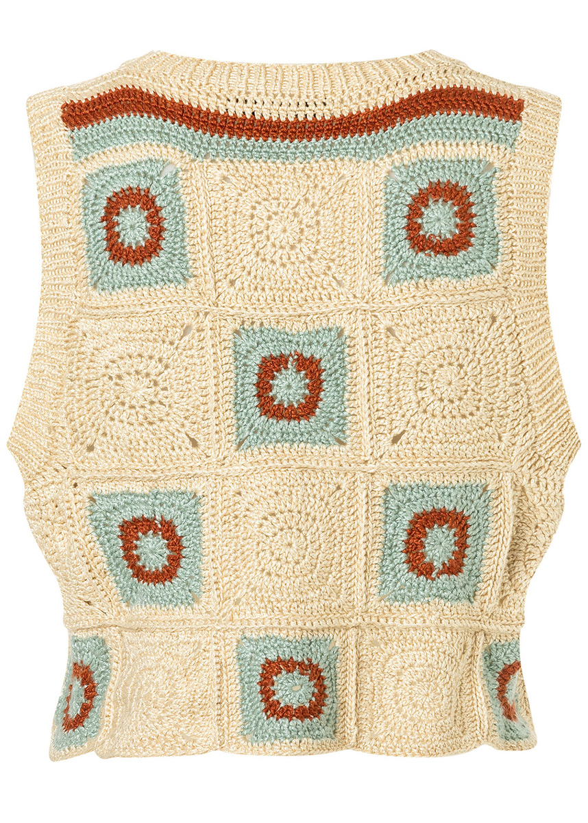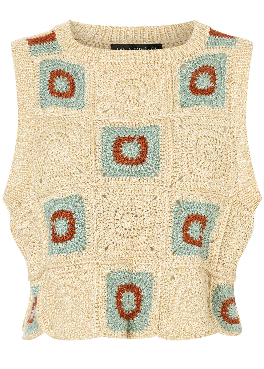 „Linarte“ (40% viscose, 30% katoen, 20% linnen, 10% polyamide, ll. = ca. 125 m/50 g) van Lana Grossa: 250 g crème (kl. 310) en telk. 50 g mint (kl. 309) en kaneelbruin (kl. 314); 1 haaknaald nr. 4 en 1 rondbreinaald nr. 3, 50 cm lang
