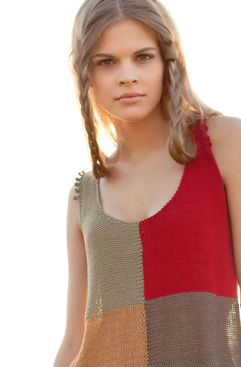 „Solo Lino“ (80% gerecycled linnen (viscose), 20% linnen, ll. = ca. 120 m/50 g): telk. ca. 100 g rood (kl. 11), cognac (kl. 10), rietgroen (kl. 8) en nougat (kl. 9); breinaalden nr. 3,5 en 4; 1 haaknld. nr. 3,5.