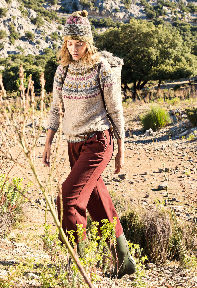 „Alpaca Peru 100“ (100% alpaca, looplengte 100 m/50 g) van Lana Grossa: 350 (400 - 450) g grège (kl. 109), 50 g roodpaars (kl. 102), 100 (150 - 150) g blauwgrijs (kl. 108), 50 g donkergrijs (kl. 117) en 50 g olijf (kl. 113); breinaalden nr. 3,5 en 4,5; verschillend lange rondbreinaalden nr. 4 en een 40 cm lange rondbreinaald nr. 3,5
