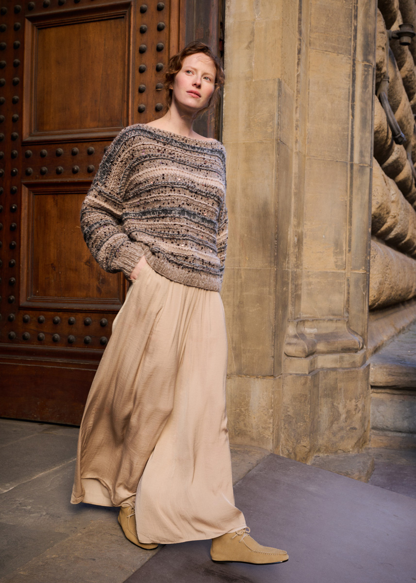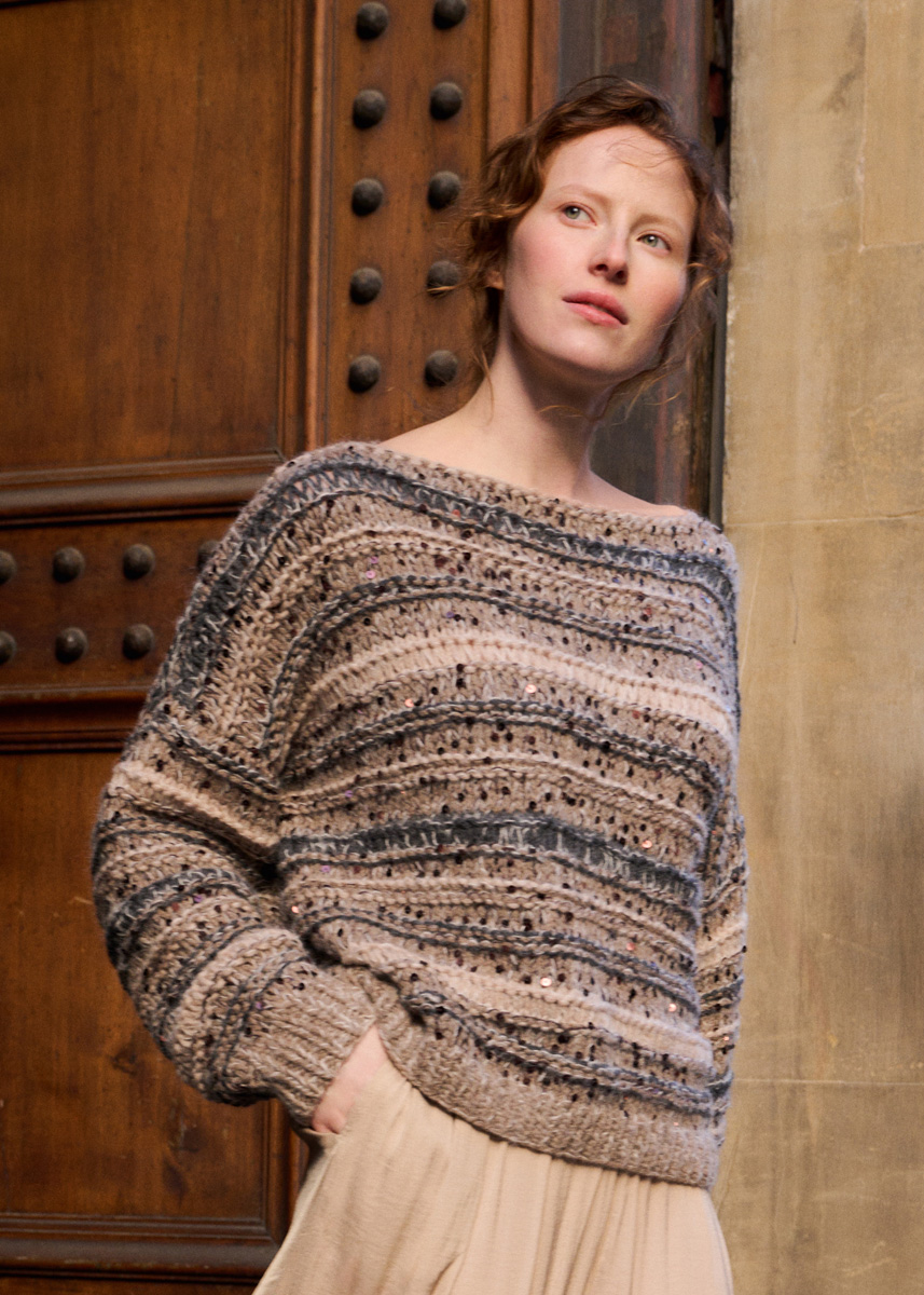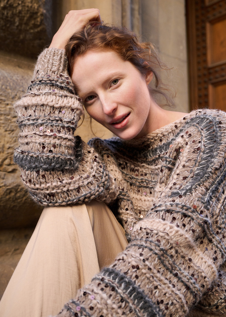 Lana Grossa-garen ‘Alta Moda Cashmere 16’ (78% scheerwol (merino), 12% kasjmier, 10% polyamide, ca. 110 m/50 g): ca. 250 (300 - 300 - 350) g taupe (kl 3), ca. 100 (100 - 150 - 150) g beige (kl 76) en ca. 100 (100 - 150 - 150) g nachtgrijs (kl 13); Lana Grossa-garen ‘Setasuri’ (69% alpaca (suri), 31% zijde, ca. 212 m/25 g): ca. 100 (100 - 125 - 125) g crème (kl 2); Lana Grossa-garen ‘Cosmo’ (100% katoen (met pailletten), ca. 260 m/100 g): 100 (100 - 200 - 200) g mokka (kl 6); breinld 8 mm en 9; korte rondbreinld 8 mm.