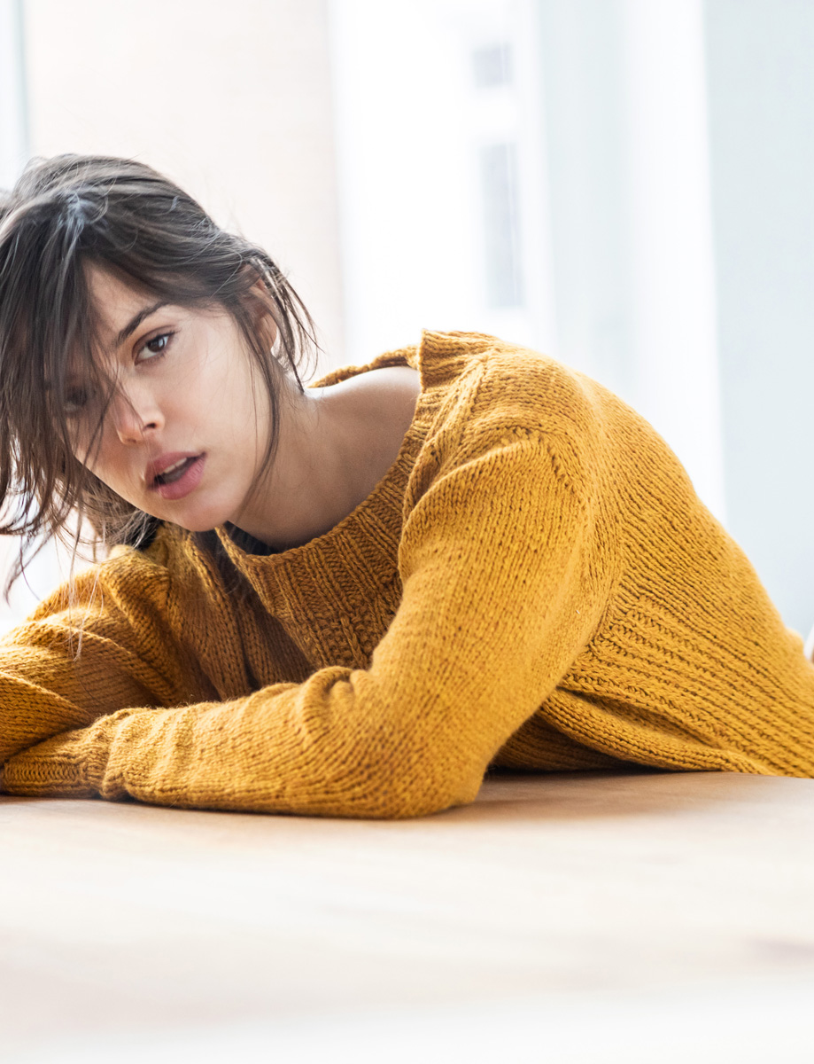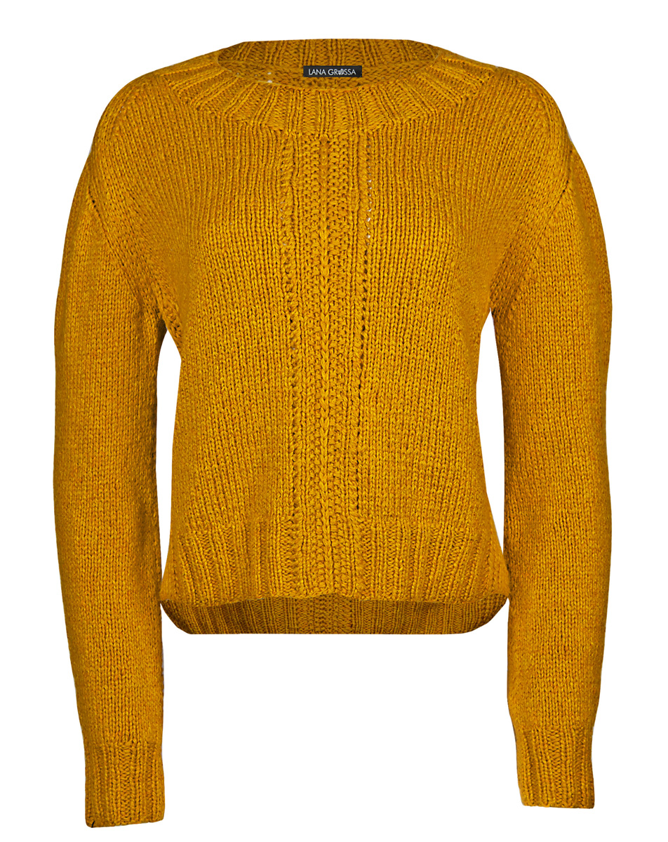 Lana Grossa Benessere (45 % katoen, 32 % alpaca, 23 % polyamide, looplengte 125 m/50 g) 400 (450 – 500) g goudgeel (kl. 10); breinaalden nr. 5 en 6, een 40 cm lange rondbreinaald nr. 5
