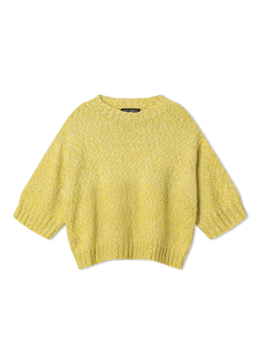 Lana Grossa-garen ‘Bottoni’ (53% katoen, 24% viscose, 23% scheerwol (merino extrafijn), ca. 125 m/50 g): ca. 400 (400 - 450 - 450) g citrusgeel/crème (kl 19); breinld 3,5 mm en 4,5 mm; 1 korte rondbreinld 3 mm.