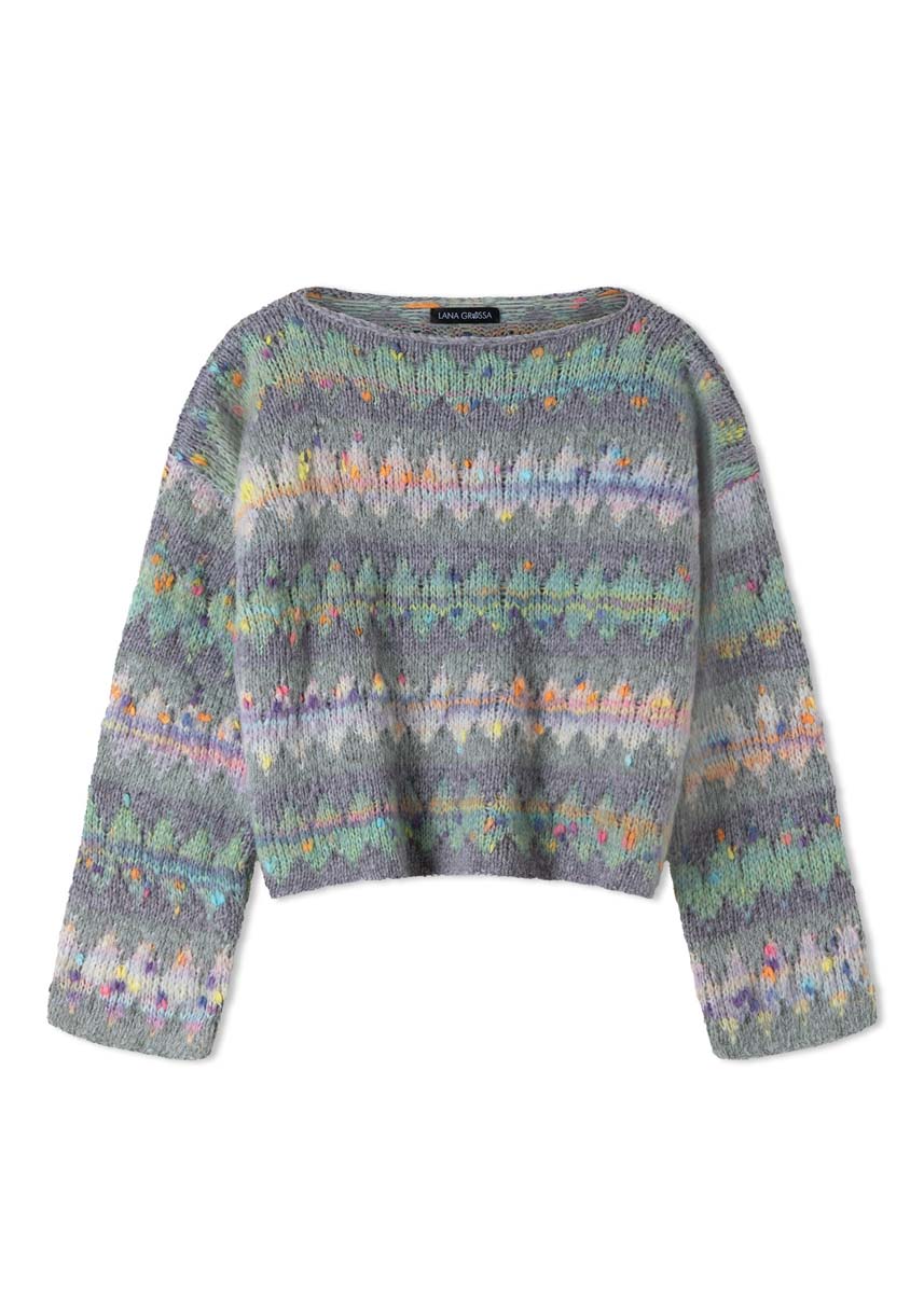 Lana Grossa Brigitte No. 2 (47% alpaca (baby), 45% katoen, 8% scheerwol (merino), ca. 140 m/50 g), 100 (150 - 150 - 200) g grijsgroen (kl 18) en lichtgrijs (kl 70) en Lana Grossa Cassata (54% scheerwol (merino extrafijn), 30% polyamide, 16% katoen, ca. 175 m/50 g), 100 (100 - 150 - 150) g naturel/geel/oranje/zalm/roze/zachtpaars/turkoois (kl 6) en zachtgroen/licht-oranje/roze/lichtgrijs/paars (kl 11); breinld 6,5 mm.