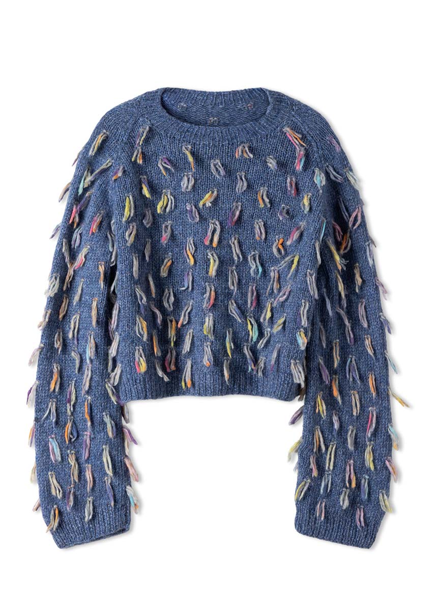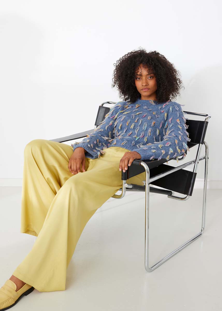 Lana Grossa Brigitte No. 2 (47% alpaca (baby), 45% katoen, 8% scheerwol (merino), ca. 140 m/50 g), 300 (350 - 400) g jeans (kl 6) en Lana Grossa Cassata (54% scheerwol (merino extrafijn), 30% polyamide, 16% katoen, ca. 175 m/50 g), 100 (100 - 150) g lichtgrijs/violet/saffierblauw/ zachtgeel/grijsroze/perzik (kl 12); breinld 4 mm en 6 mm; een 40 cm rondbreinld 4 mm; 2 markeerringen; 4 hulpnld.