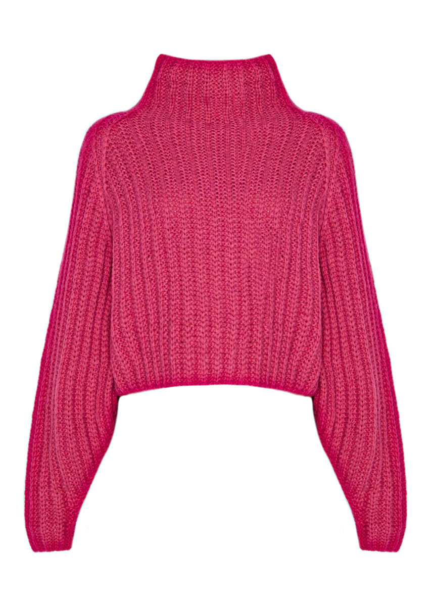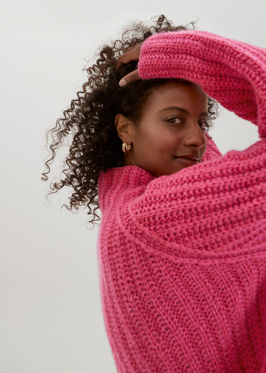 Lana Grossa-kvalitet „Brigitte No. 2“ (47 % (baby) alpaka, 45 % bomuld, 8 % ren ny uld (merino), løbelængde = ca. 140 m / 50 gr.): ca. 400(450) gr pink (fv 19), strikkepinde nr. 7, rundpind nr. 7, 50 cm.