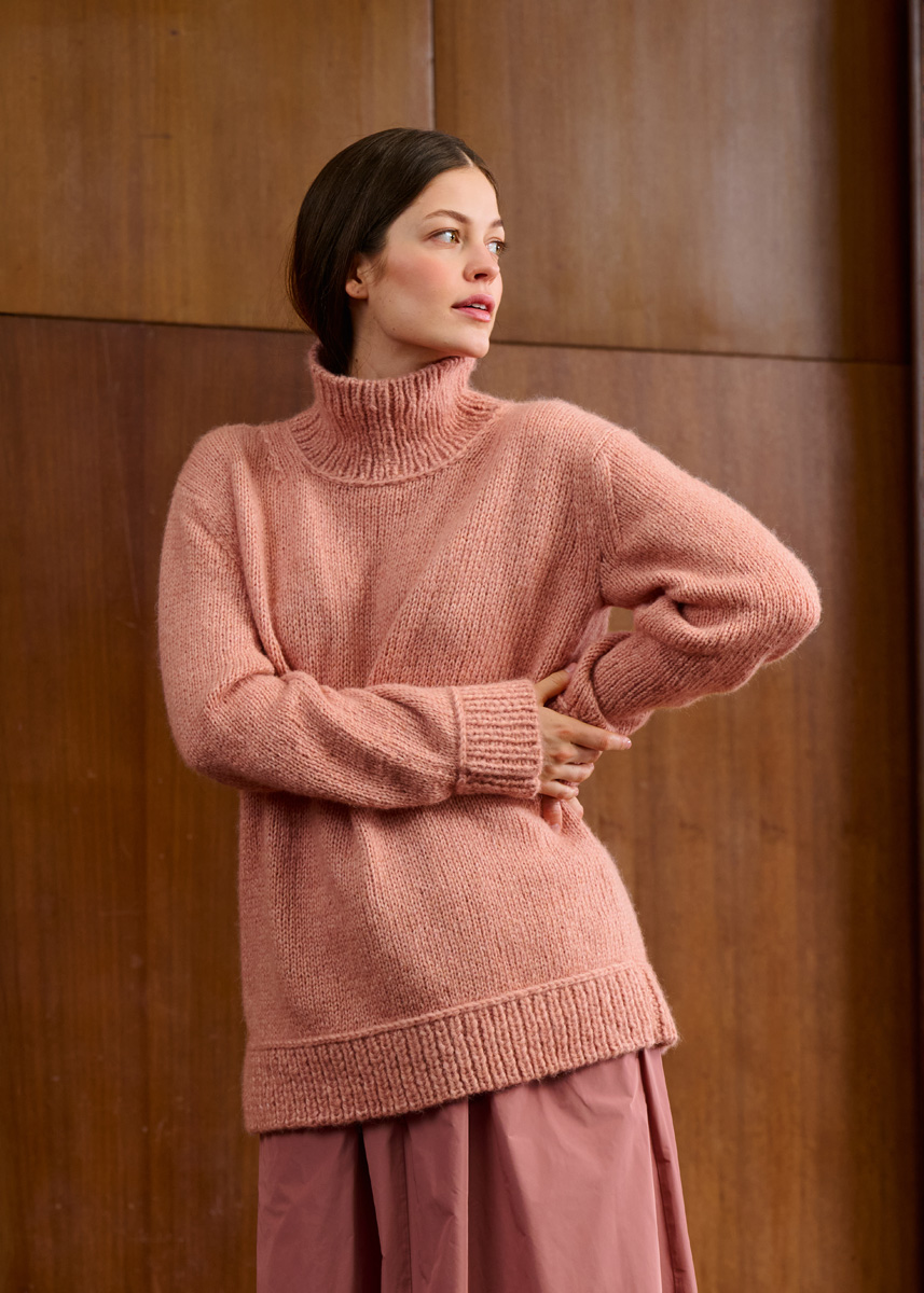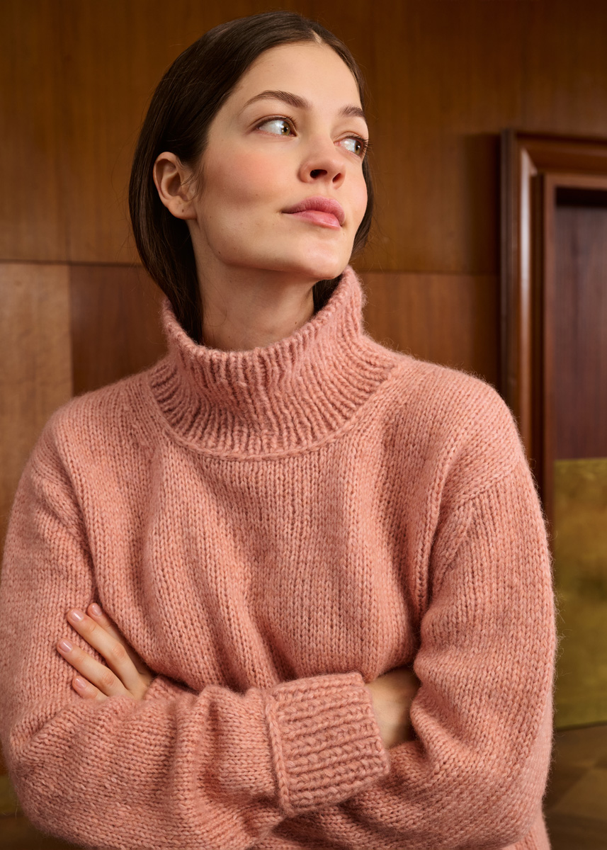 Lana Grossa Brigitte No. 2 (47% alpaca (baby), 45% katoen, 8% scheerwol (merino), ca. 140 m/50 g), 500 (550 – 600) g perzik (kl 55); breinld 6 mm en 6,5 mm, en 1 setje breinld zonder knop 6 mm en 6,5 mm.