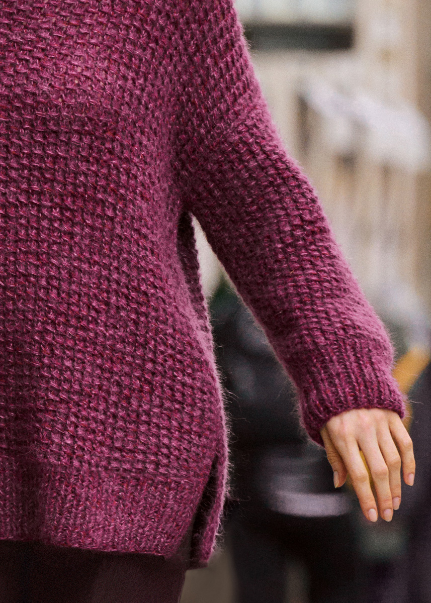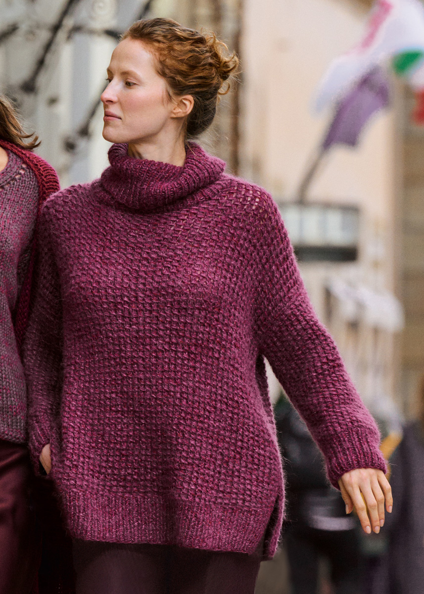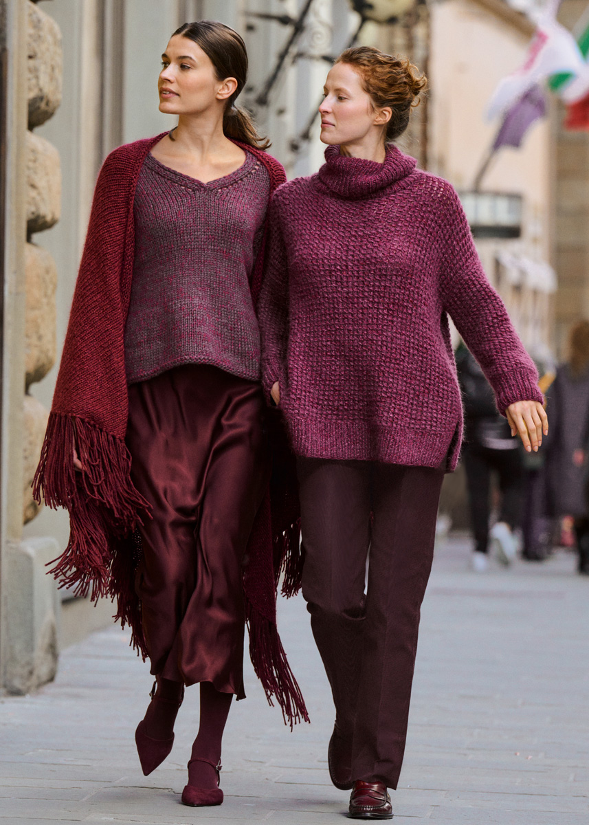 Lana Grossa-garen ‘Cashmere 16 Fine’ (80% scheerwol (merino), 10% kasjmier, 10% polyamide, ca. 320 m/50 g): ca. 100 (150 - 150 - 150) g Bourgondisch rood (kl 58); Lana Grossa-garen ‘Setasuri’ (69% alpaca (suri), 31% zijde, ca. 212 m/25 g): ca. 125 (150 - 175 - 200) g bordeaux (kl 31); breinld 7 mm en 8 mm; 1 korte rondbreinld 7 mm.