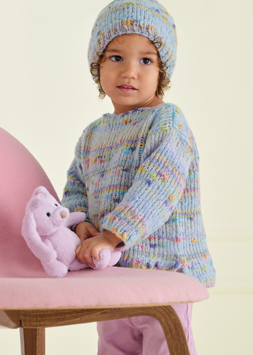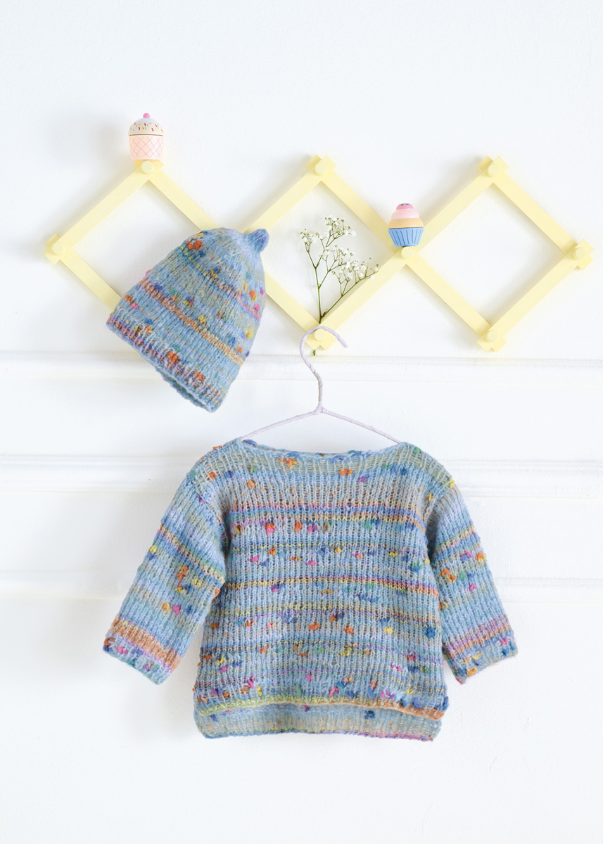 Lana Grossa Cassata (54% scheerwol (merino extrafijn), 30% polyamide, 16% katoen); ca. 175 m/50 g): 50 (100/100/100/150) g lichtblauw/felroze/geel/oranje/ blauwpaars (kl. 5); rondbreinld 5 mm; 2 markeerringen.